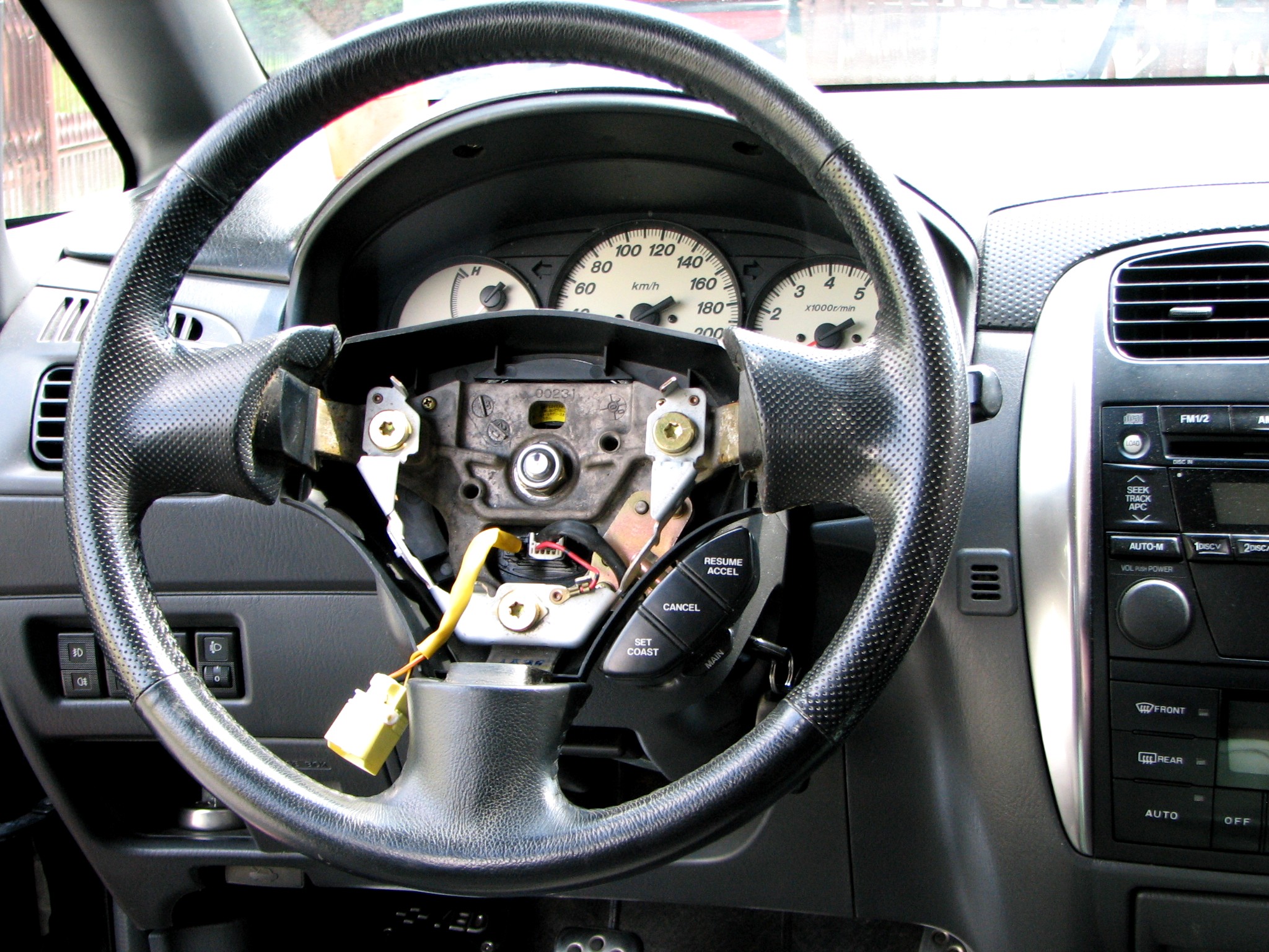 Dla nie wtajemniczonych, po założeniu trójramiennej kiery (z mazdy 323f sport) która nie miała sterowania radiem, stwierdziłem że spróbuję zamontować do niej sterowanie ze "starej" czteroramiennej kierownicy, jakie było oryginalnie. Z demontażem tegoż ustrojstwa nie było problemu (trzy śrubki), gorzej było z adaptacją w nowej kierze, której środek jest dużo mniejszy (dlatego wg. mnie jest ładniejsza