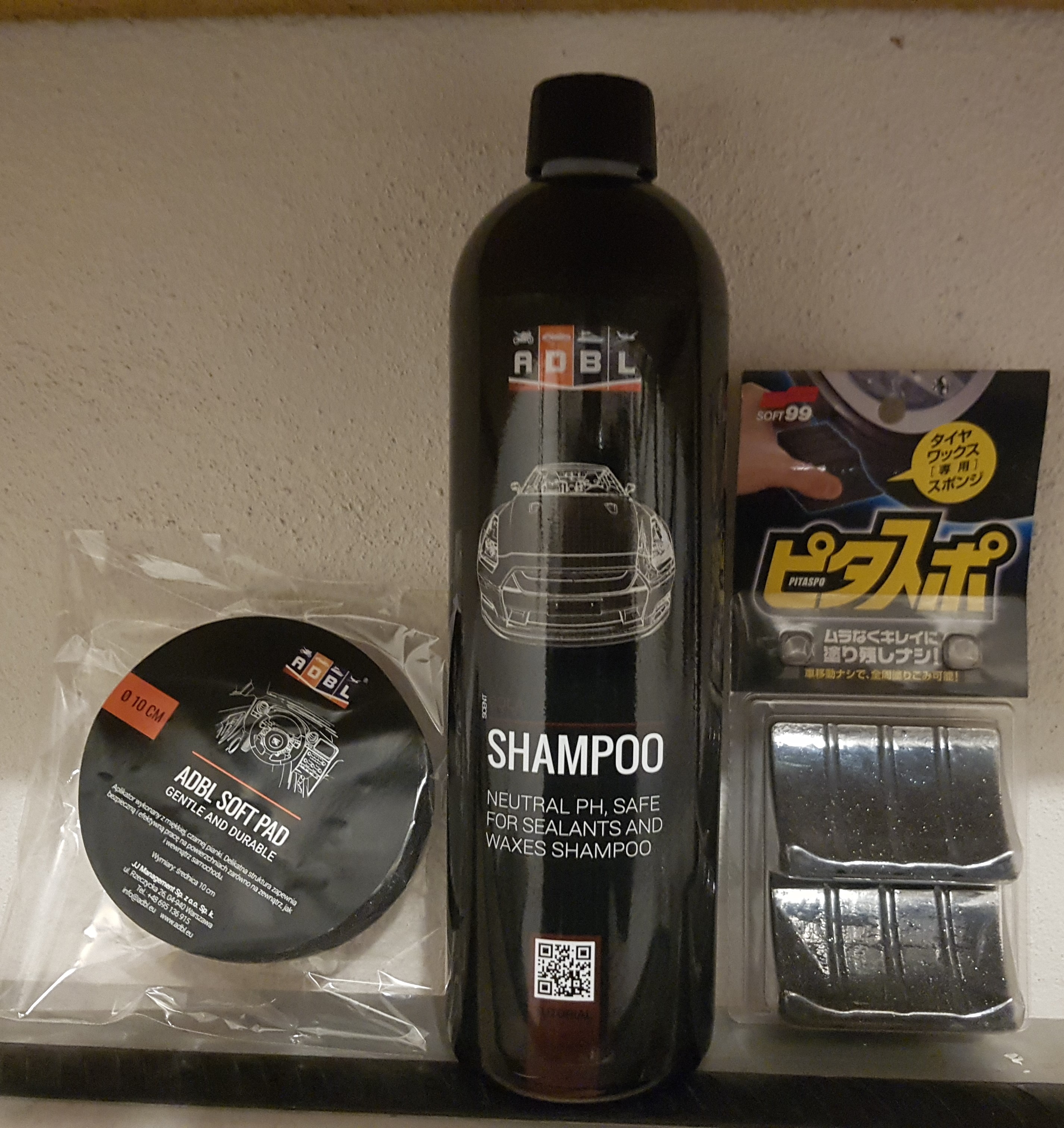 Przy okazji byłe w pobliży MX Nowicki więc standardowo wpadłem i uzupełniłem braki. Szampon się skończył, więc postanowiłem teraz wypróbować ADBL. Do tego rozwalił mi się już aplikator do opon, więc wpadły nowe od Soft99 oraz aplikator do wosku Soft99 produkcji ADBL, bo ten oryginalny od Soft99 to straszna lipa, która nasiąka niemiłosiernie.