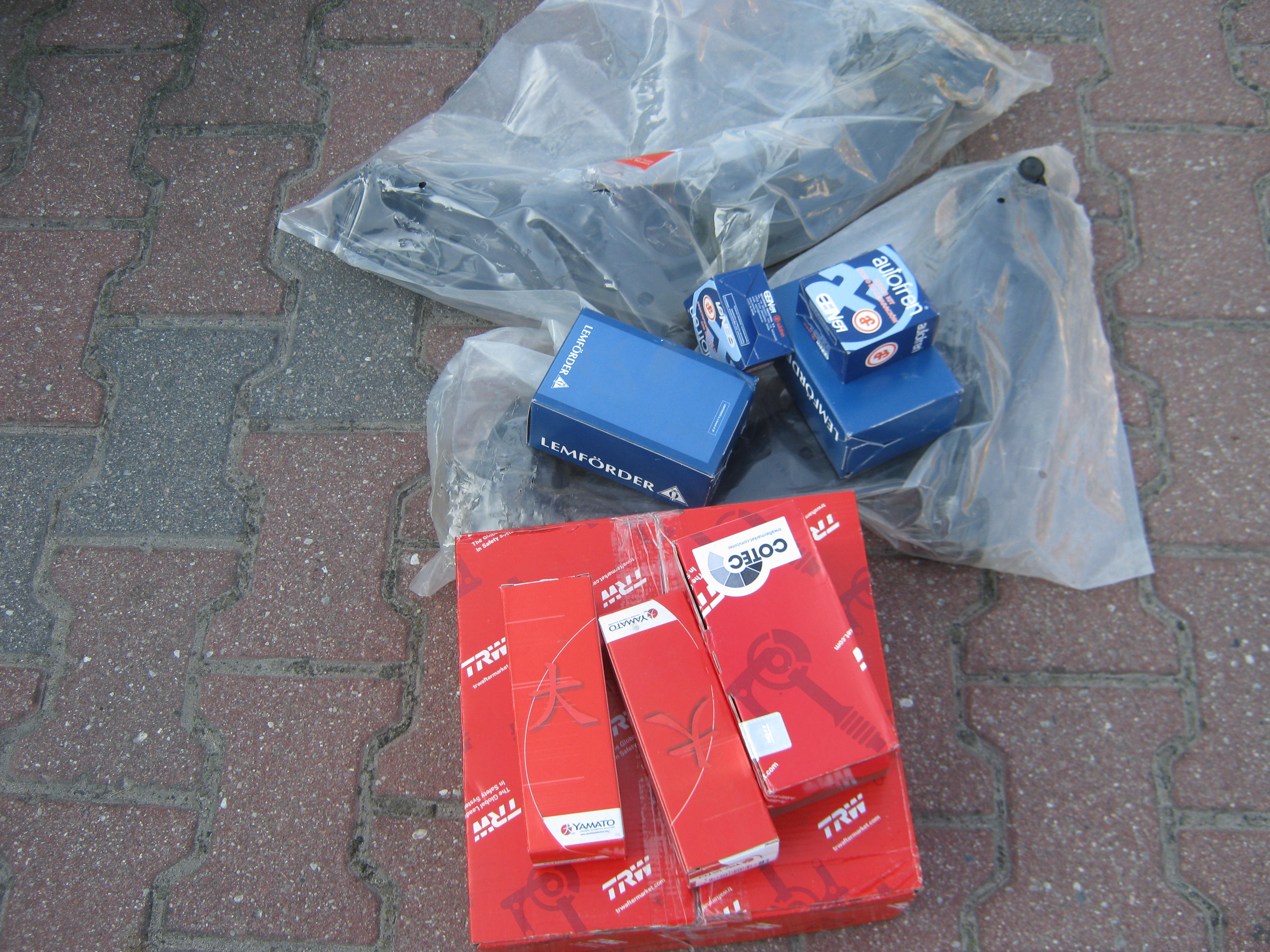 Dziś zamówione klocki i tarcze na przód TRW, 2 wahacze na przód Yamato, 2 łączniki Lemforder, 2 końcówki drążków Yamato, i zestaw naprawczy do zacisków