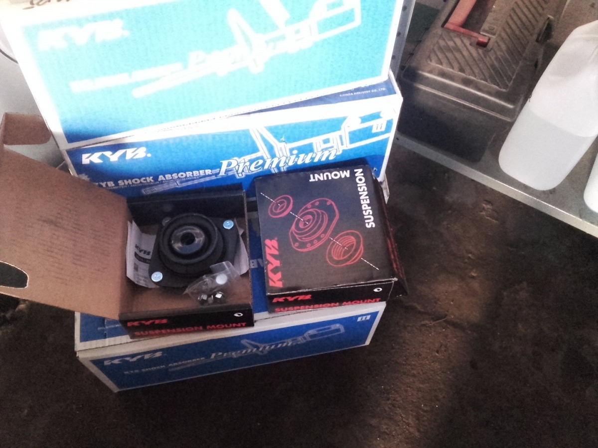 Komplet amortyzatorów KYB przód, tył + poduszki amortyzatorów z łożyskiem KYB, na przód ( z tyłu były wymienianie w zeszłym roku ) oraz osłony z oddzielnym poliuretanowym odbojem KYB.
