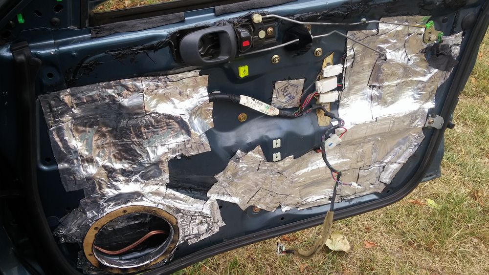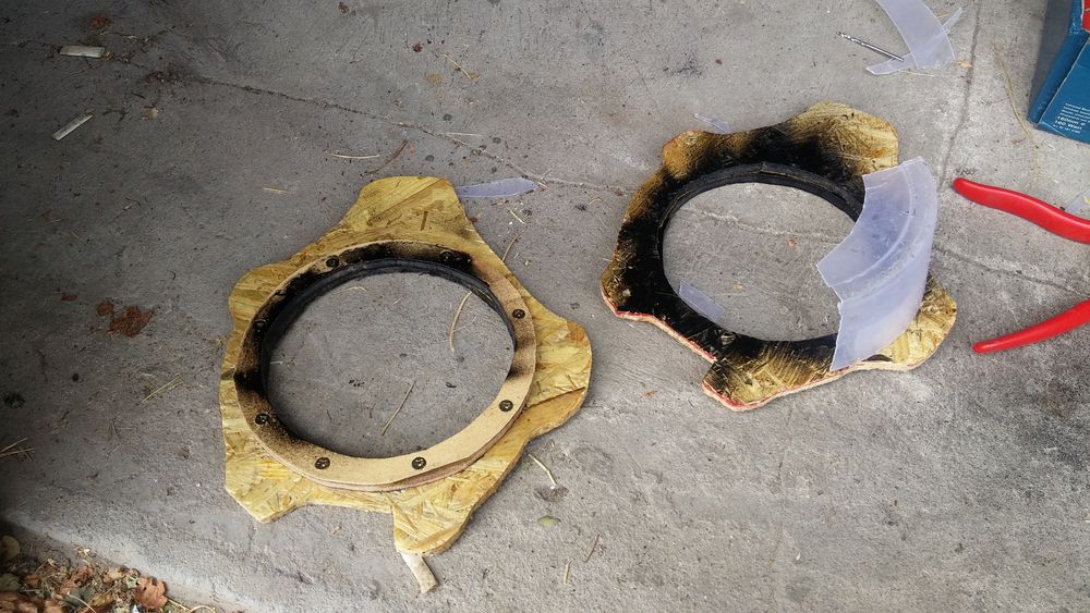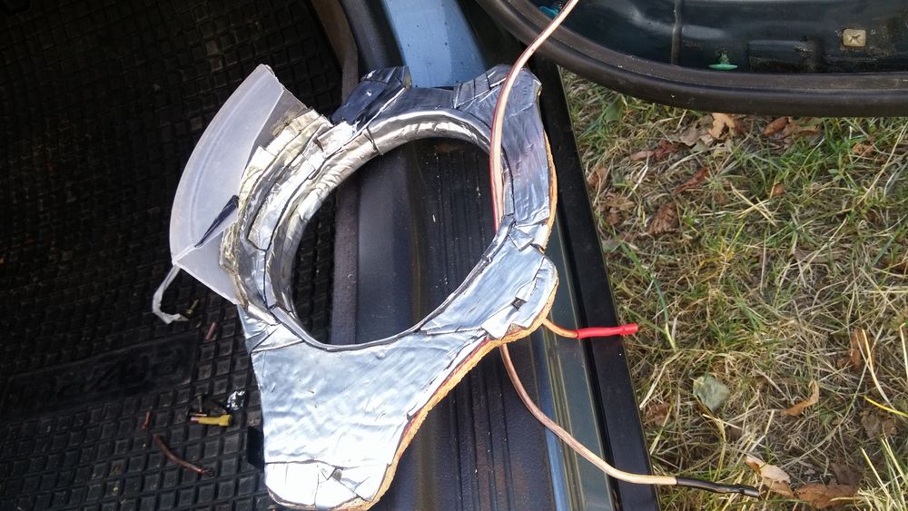 Użyłem 8mm płyty osb i panelu podłogowego bo jest twardy. Powycinane, poskręcane, "daszek" od wody też zrobiłem. Polakierowane bardzo porządnie, zużyłem ponad litr bezbarwnego lakieru, potem jeszcze jakimś czarnym glutem pociągnąłem po wycięciu wew. dystansów. Na sam koniec okleiłem je na grubo taśmą dekarską bo nie miałem gdzie dzisiaj kupić mat (1 dystans waży ponad kilogram). Taśmą pociągnąłem też po drzwiach gdzie była naklejona mata. Całych nie oklejałem, jedynie najmniej sztywne miejsca. Pod matami w otworach konstrukcyjnych jest 1mm blacha przykręcona do drzwi, więc otwory zaślepione nie tylko matą. No i co... w poniedziałek rozbieram drugie drzwi. Zrobilem też małe strojenie całego zestawu i... suba nie trzeba
