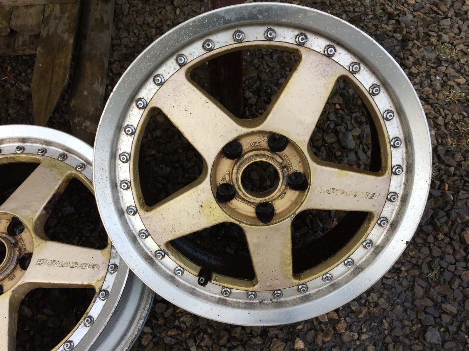No troche to trwalo w sumie felgi maja dosyc dziwne parametry jak na Mazdaspeedy. Na ogół były z rx7 fd 8j przód 9j tył więc troche za bogato do mx6... Te akurat odziwo przyjechały z Japonii na Mazdzie Bongo??? Parametry 7j 4szt i et30 wiec wkomponuje się w nadkola mx6 idealnie, aleeee będzie troszke zmiana mianowicie tył zostanie przerobiony na 8j i et35 przód zostanie jak jest (oczywiście posługując się bębnem i rantem z innych felg raysa żeby został w orginale;p