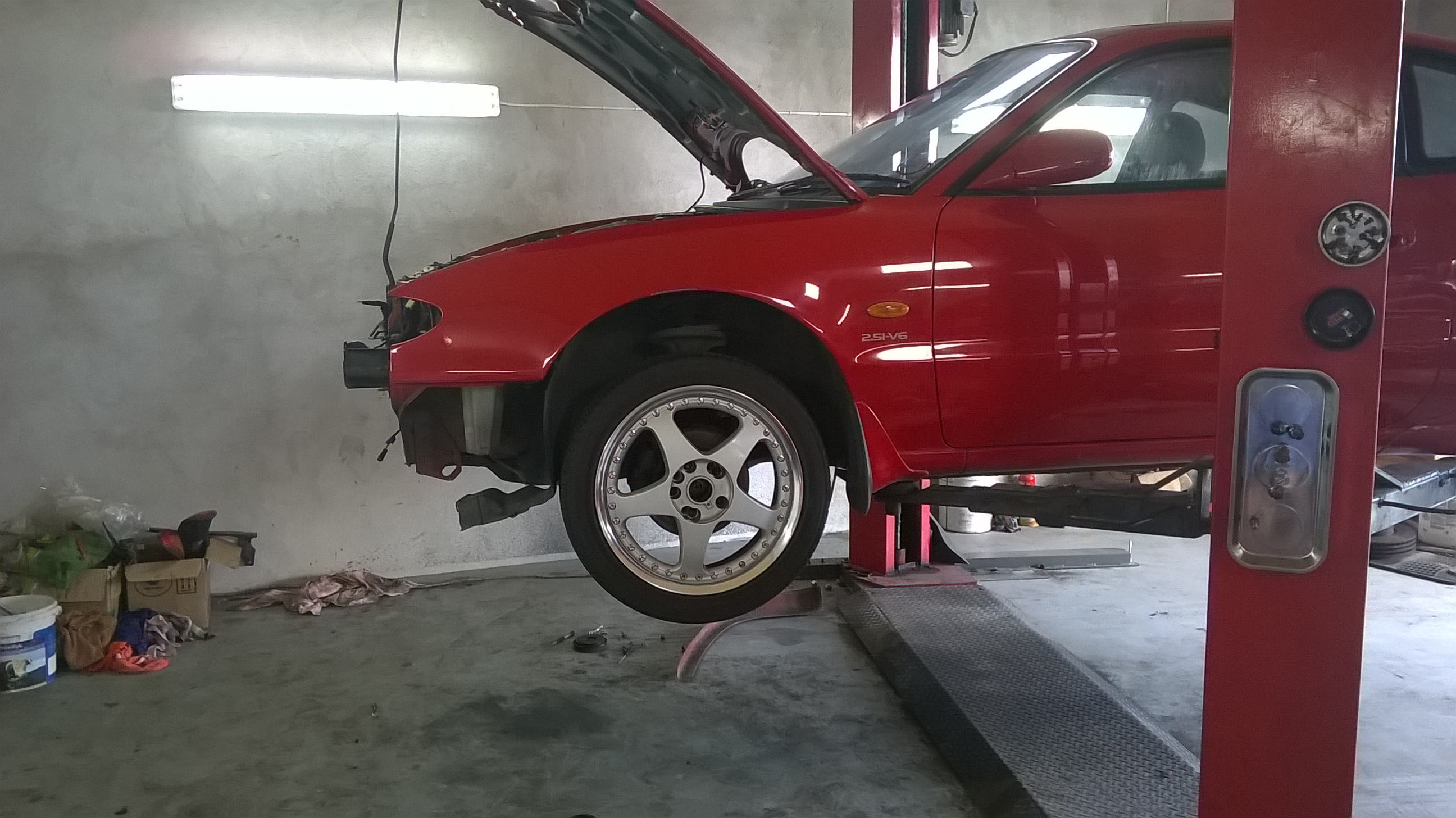 Witajcie, chciałbym zaprezentować wam moje weekendowe wozidełko jakim jest Mazda Mx-6 2.5i V6. Autko posiadam już ponad 2 lata jednak przez ten czas przestała nie używana w garażu ponieważ nie miałem czasu się nią zająć :( Dopiero około msc temu wyjechała z garażu i ujrzała światło dzienne :). Autko odebraliśmy z Maliniakiem za co ukłony za pomoc :D I w tym momencie czeka na konkretne przygotowanie na zlot w Rykach :). Może troche historii : Auto kupiłem dosyć okazyjnie w uk buda oprócz ogniska korozji przy uszczelce szyby przód nie miało ani nie ma żadnych oznak rdzy <jupi> Wszystko było fajnie po zakupie, ale nigdy nie może być zbyt pięknie, wszystko było już zabukowane prom itd, lecz niestety dzień przed wyjazdem zobaczyłem, że pedał hamulca opada i to znacznie.... Pomyślałem może mało płynu (fakt było mało) dolałem, ale po chwili znów zbiorniczek zrobił się pusty. Okazało się, że przedni zaciski spod uszczelki tłoka miał wyciek. W tym momencie bez narzędzi ani nowej reperaturki nie było możliwości naprawy. Więc padła decyzja lecimy do pl przed nami 1700km na ledwo działających heblach... Przez Anglie jakoś się udało jednak jak zjeżdzałem z promu hamulcy już było brak... Więc podsumowując 1 w nocy w Calais. około 1250km do domu i 7 godzin czasu bez większego ruchu padła kolejna super mądra decyzja :D Lecim ile fabryka dała <spoko> i o godzinie 7.30 byłem w warszawie powoli zaczeły sie robić korki, a ja w ostaniej chwili zajeżdzam pod dom :D Krótko mówiać z przygodami, ale ważne, że się udało. MX dojechał i już tutaj raczej zostanie na dożywocie :D Dobra konkretnie sie rozpisałem może teraz troche specyfikacji :D