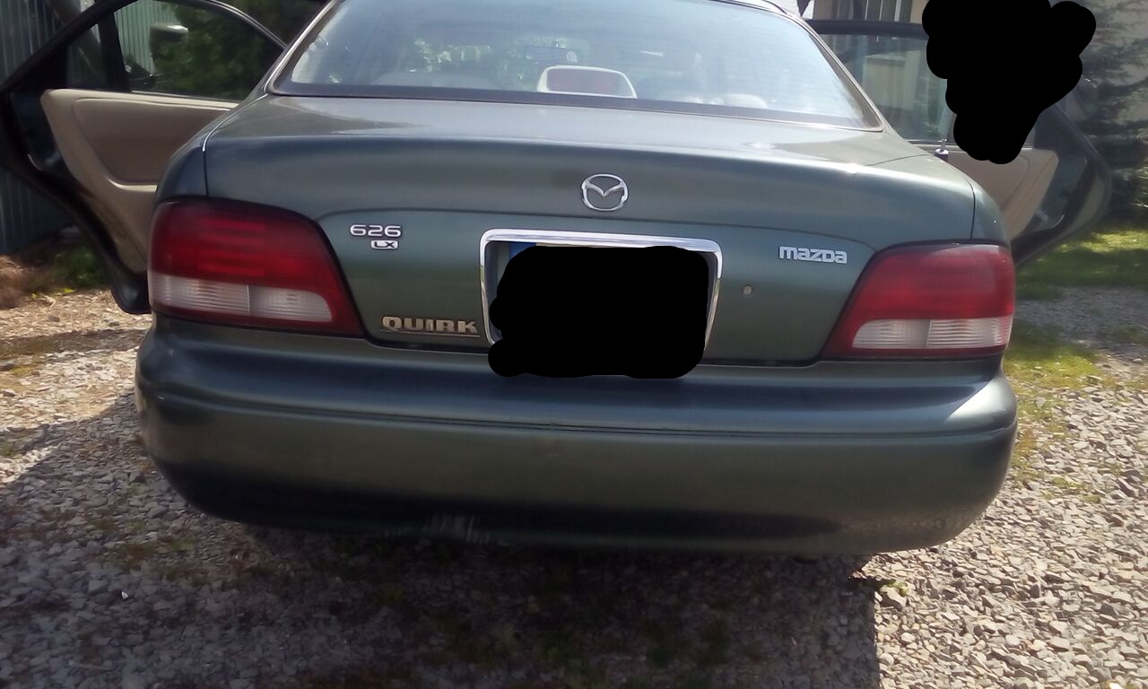 Chcę przedstawić rodzinny samochód, który wymaga zrobienia blacharki i lakieru, czyli Mazda 626 GF z USA. Samochód został wyprodukowany według tabliczki znamionowej 23 marca 1998 r. Pierwsze kilka lat Mazda spędziła w Stanach, potem poleciała do Polski. Podobno stała i rdzewiała. Teraz jesteśmy 2 lub 3 (osoby przed nami, którzy byli właścicielami niby były rodziną) właścicielem. Czekam na opinię "Ona powinna pójść na złom, Jezus, jako brzydka!" :D. Ma instalację gazową, choć i tak trzeba ją wyregulować, bo na gazie ledwo chodzi.