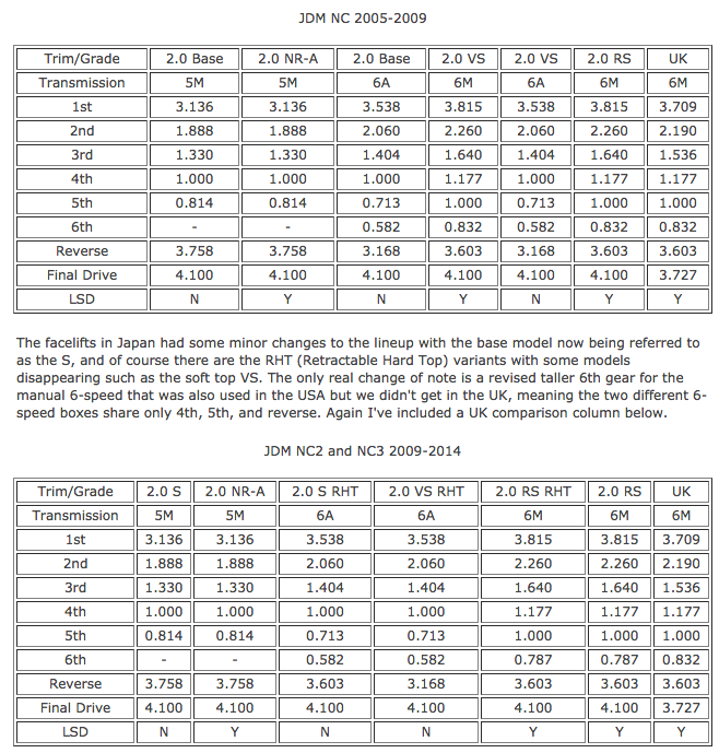 In the UK we had a choice of 1.8 litre 5-speed, 2.0 litre 5-speed, and 2.0 litre 6-speed. A limited slip differential was fitted to all 2.0 litre models, though the final drive ratio is different to match the 5 and 6 speed transmissions. Mazda used the simple and cost effective Super LSD type which uses cone shaped clutch plates in addition to gears, rather than the helical gears Zexel Torsen branded differential used in the earlier models. (...)