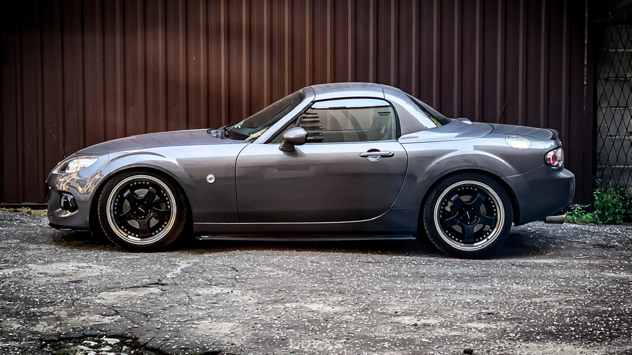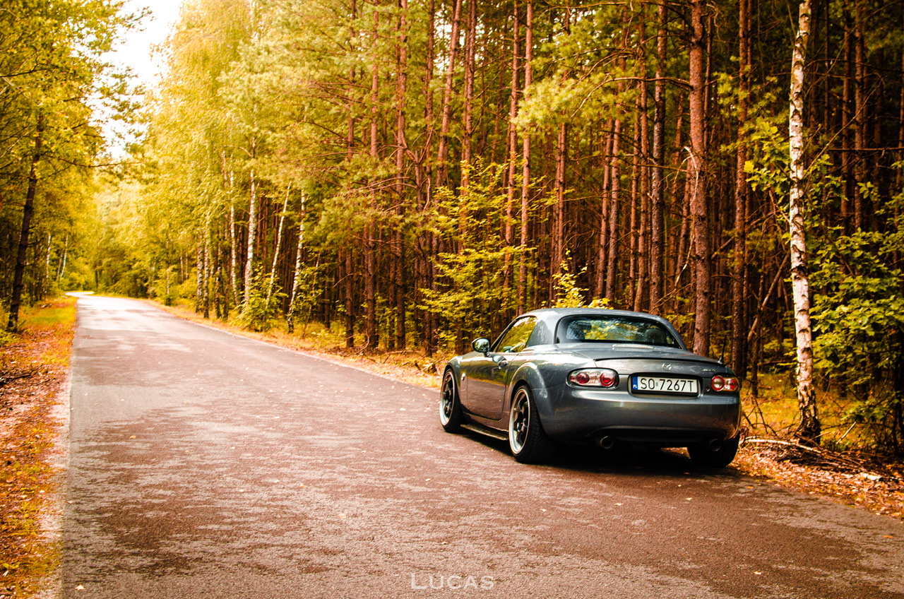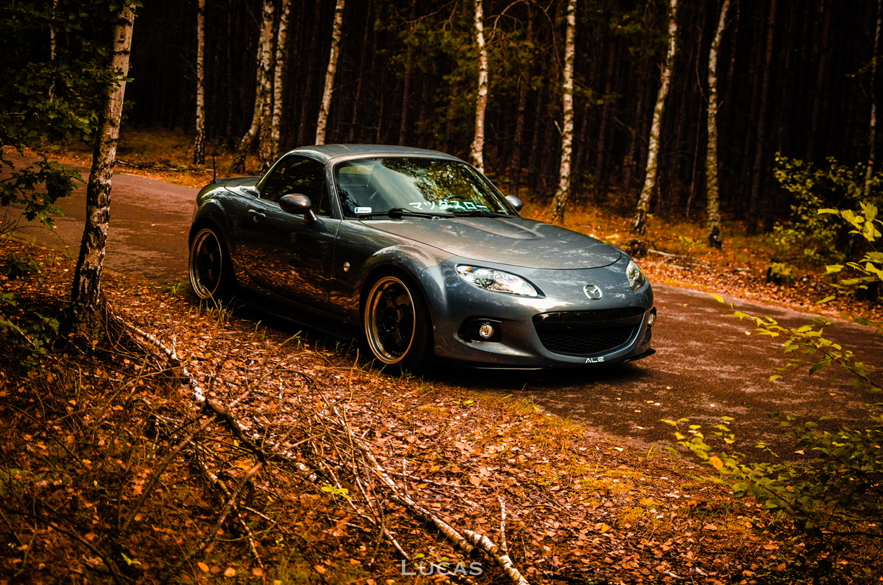 Oto ona – NC PRHT w kolorze Galaxy Grey, który na zdjęciach nigdy mi się nie podobał a na żywo spowodował opad szczęki (choć po srebrnym RX-8 chyba nawet różowy byłby ok, nigdy więcej srebrnego samochodu <dupa> ) z silnikiem 1.8 (chciałem 2.0 ale jestem bardzo pozytywnie zaskoczony tym, jak chodzi to 1.8 – spodziewałem się, że będzie porównywalnie jak w NB z 1.6 a tu przy 140 na piątym biegu wciskam gaz i można normalnie wyprzedzać bez redukowania, powiem szczerze myślałem że auto nie będzie chciało jechać, szczególnie po przesiadce z mocniejszego samochodu ale jednak nie jest tak źle, szczególnie, że wersja PRHT jest cięższa od soft topa)