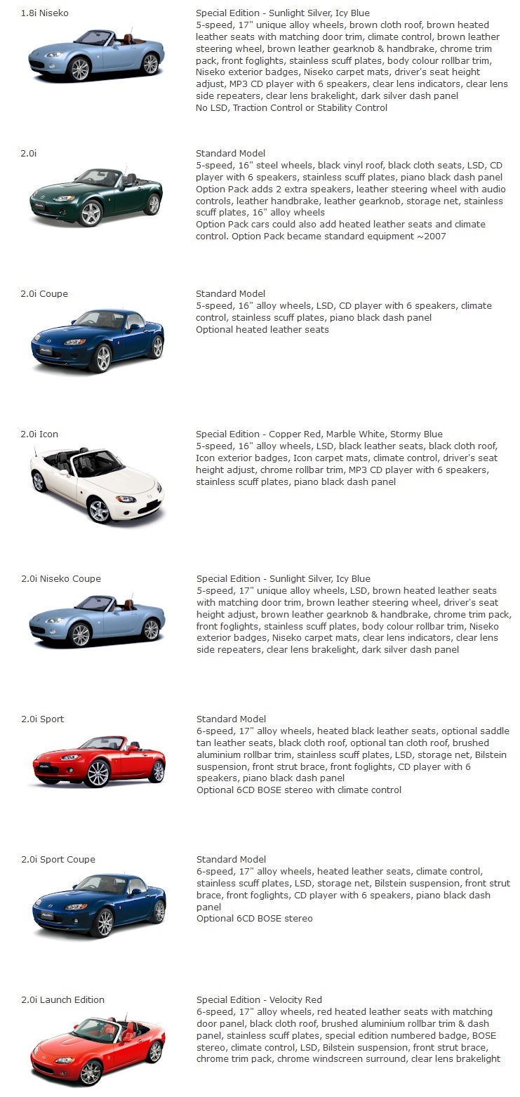 Klikajac dalej po roadsterblogu, mozna tez nalezc taka tabelke na temat wersji wychodzacych na rynek japonski: