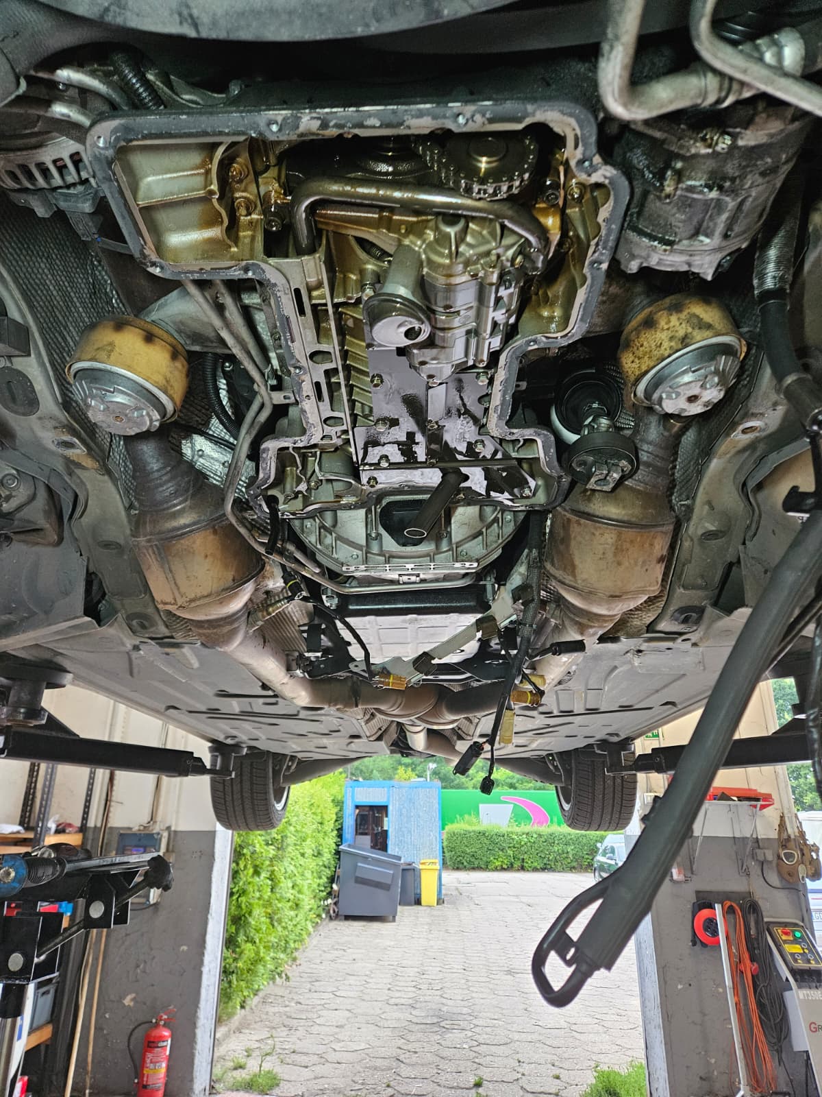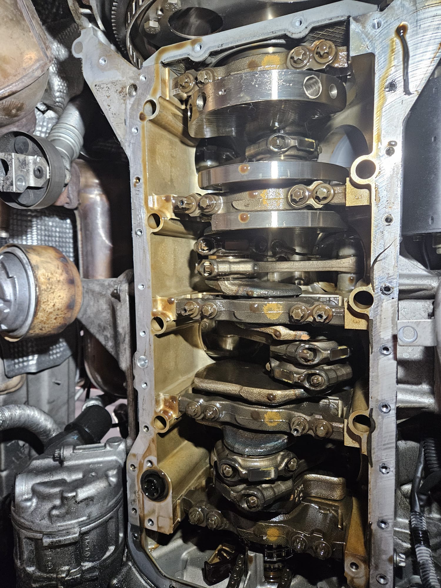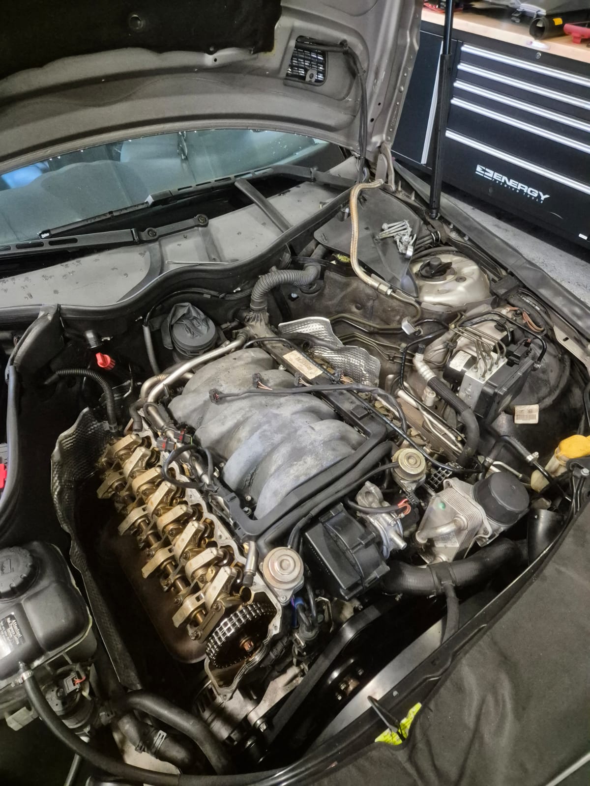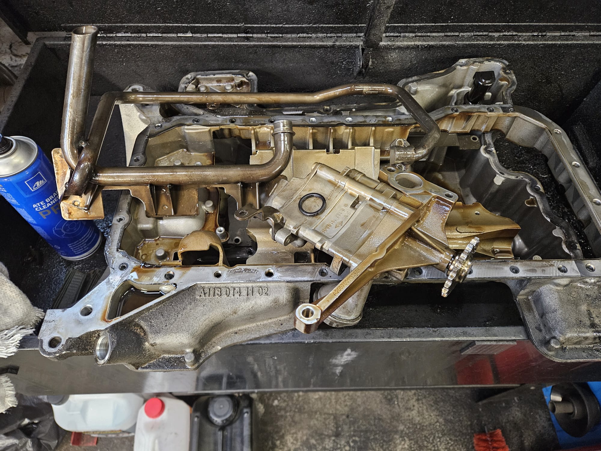 Na pierwszy ogień poszły wahacze przód, komplet, bo były w tragicznym stanie. Przy tej samej robocie zdjąłem wózek i zacząłem walkę z wyciekami na dole silnika. Miska w 5.4 jest dwuczesciowa i ma 2 'ssaki' oleju, więc pompa i miska jest troszkę bardziej skomplikowana niż w zwykłym 5.0.