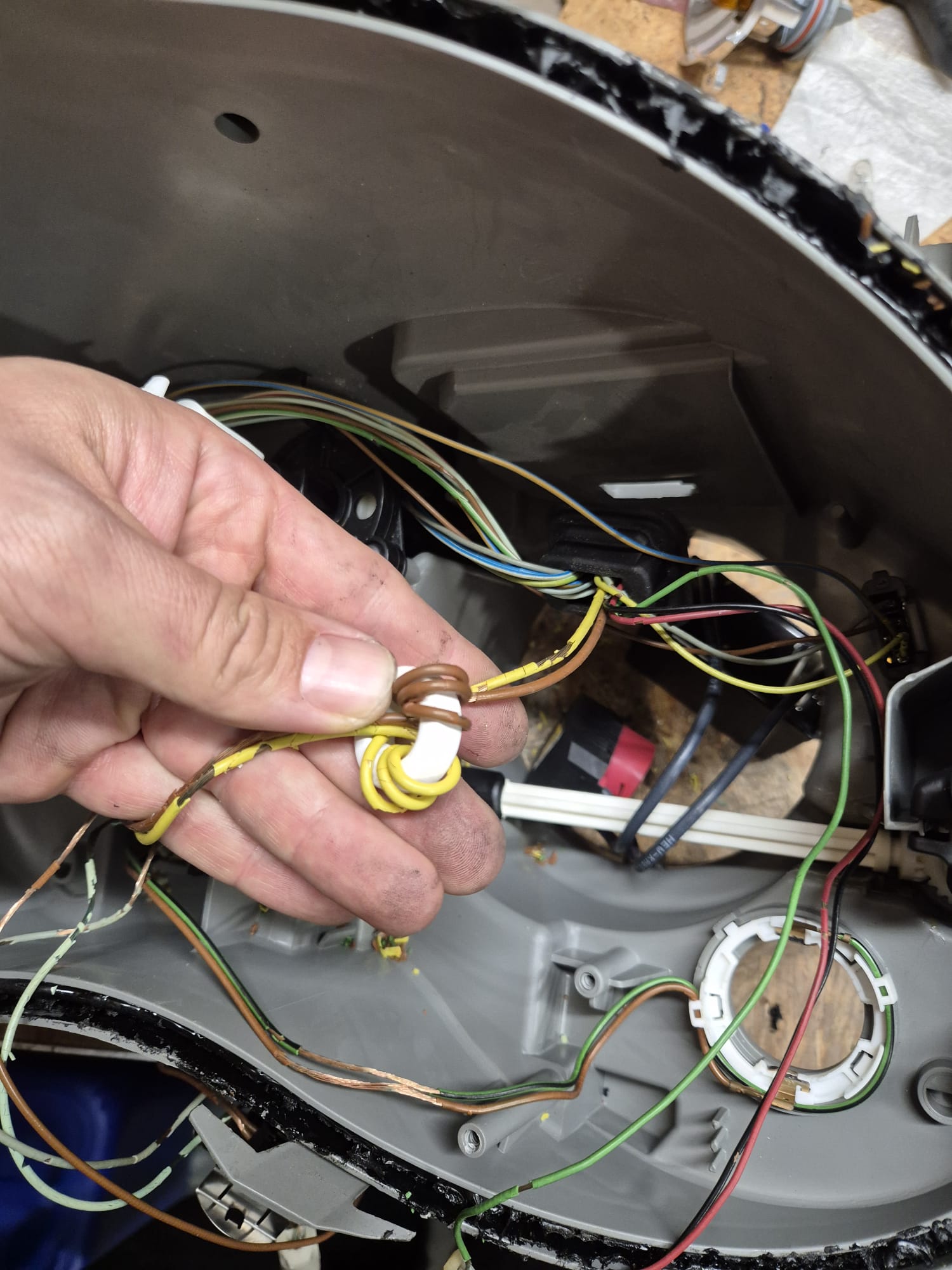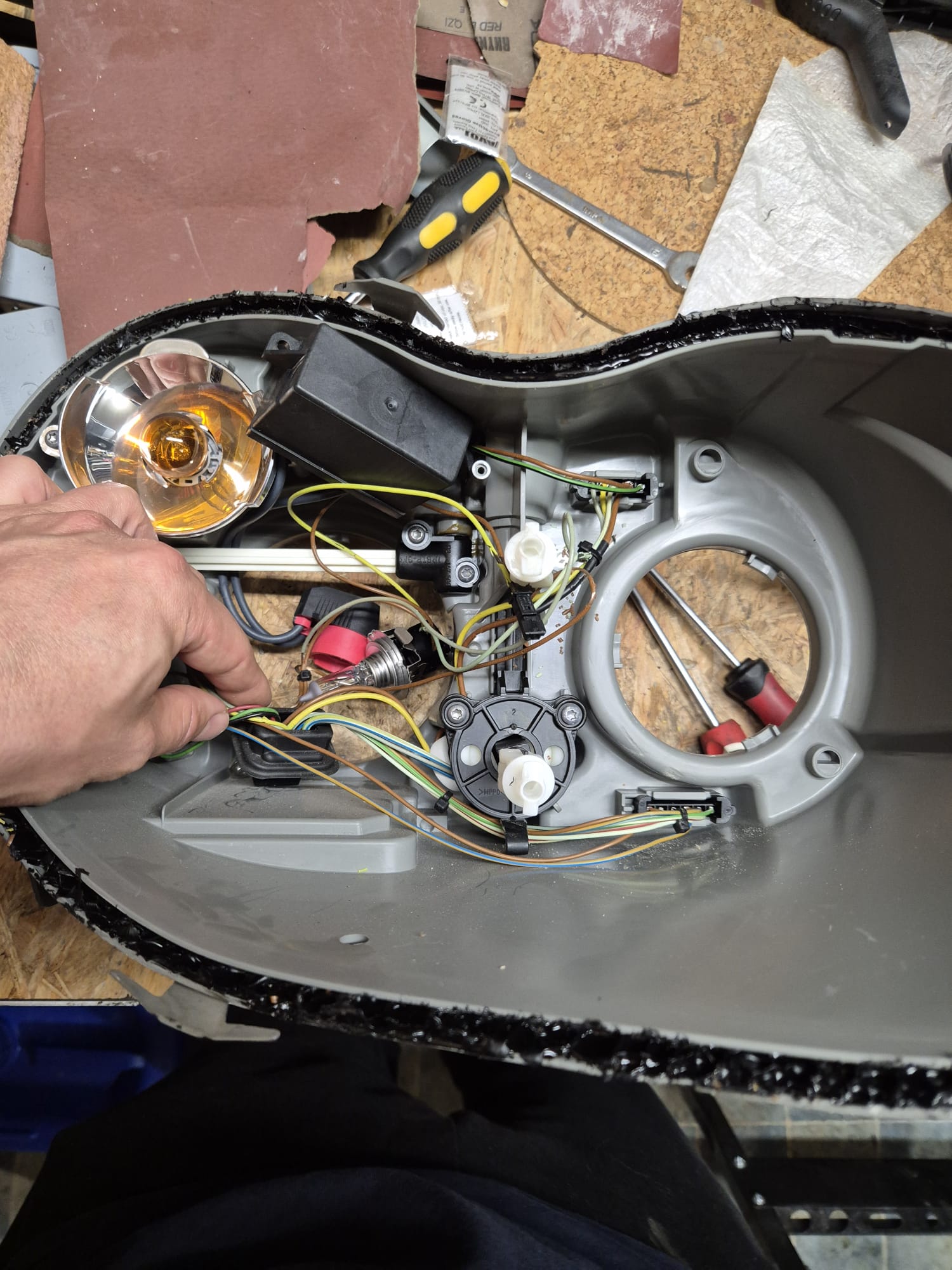 Tutaj roboty było niestety więcej niż zakładałem. Miały być wymienione klosze, odbłyśniki xenonu i koniec. Po rozebraniu lampy okazało się, że izolacja wiązki sypie się od dotknięcia. Musiałem to wszystko rozgrzebać, zaizolować, poskładać. Przy okazji projektory fabryczne zmieniłem na EVOX-R.