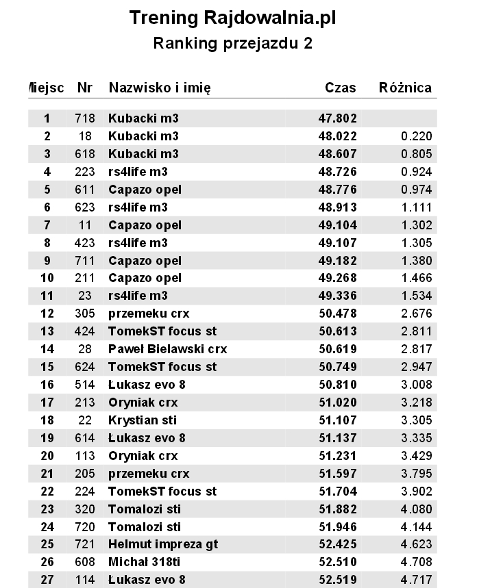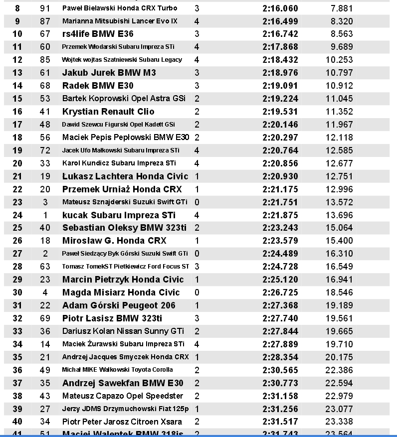 Dzisiaj kolejny dzien na torze we wrocku. Ostatni trening przez sobotnimi zawodami. Heble wkoncu sie nie przegrzewały, wiec dzionek zaliczony do udanych. Ponizej wyniki a fotki beda, jak beda:D