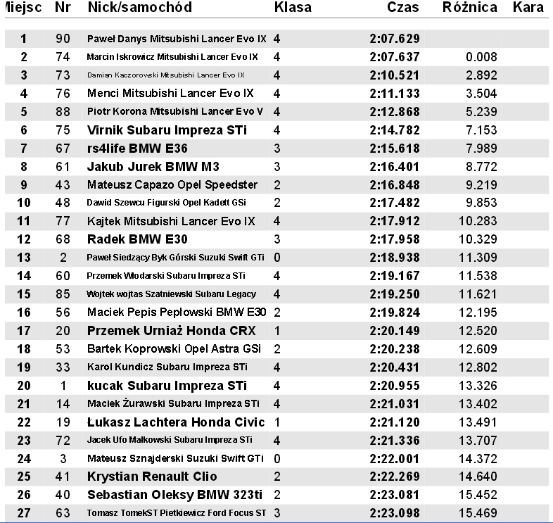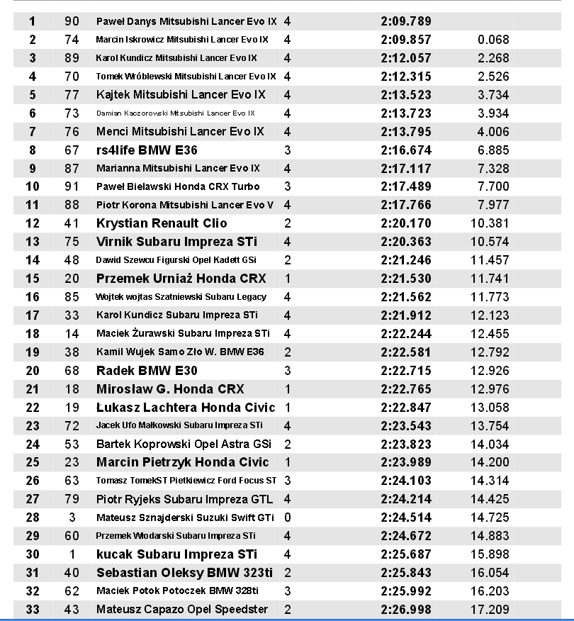 . Wkocu sie wkurzylem wyszarpnalem wtyczke od kompa abs'u i jak reka odial. Mogem panowac nad autem i hamowac kiedy ja chce a nie jak wczesniej w ogole:P Na kolejne zawody napewno musi wleciec porzadny slick na przod bo tego brakowalo. W 3 przejezdzie poniosla mnie fantazja i na szykanie obrocilo mnie ze 2 razy. Natomiast na 4 biegu bylo juz grubo, na jeden z szykan udalo mi sie uratowac przod ale lekko boczkiem musnalem oponki, za to czas wykrecony mega. Wrazenia pozytywne, doswiadczenie zebrane, auto nie rozbite wiec wszytsko Si