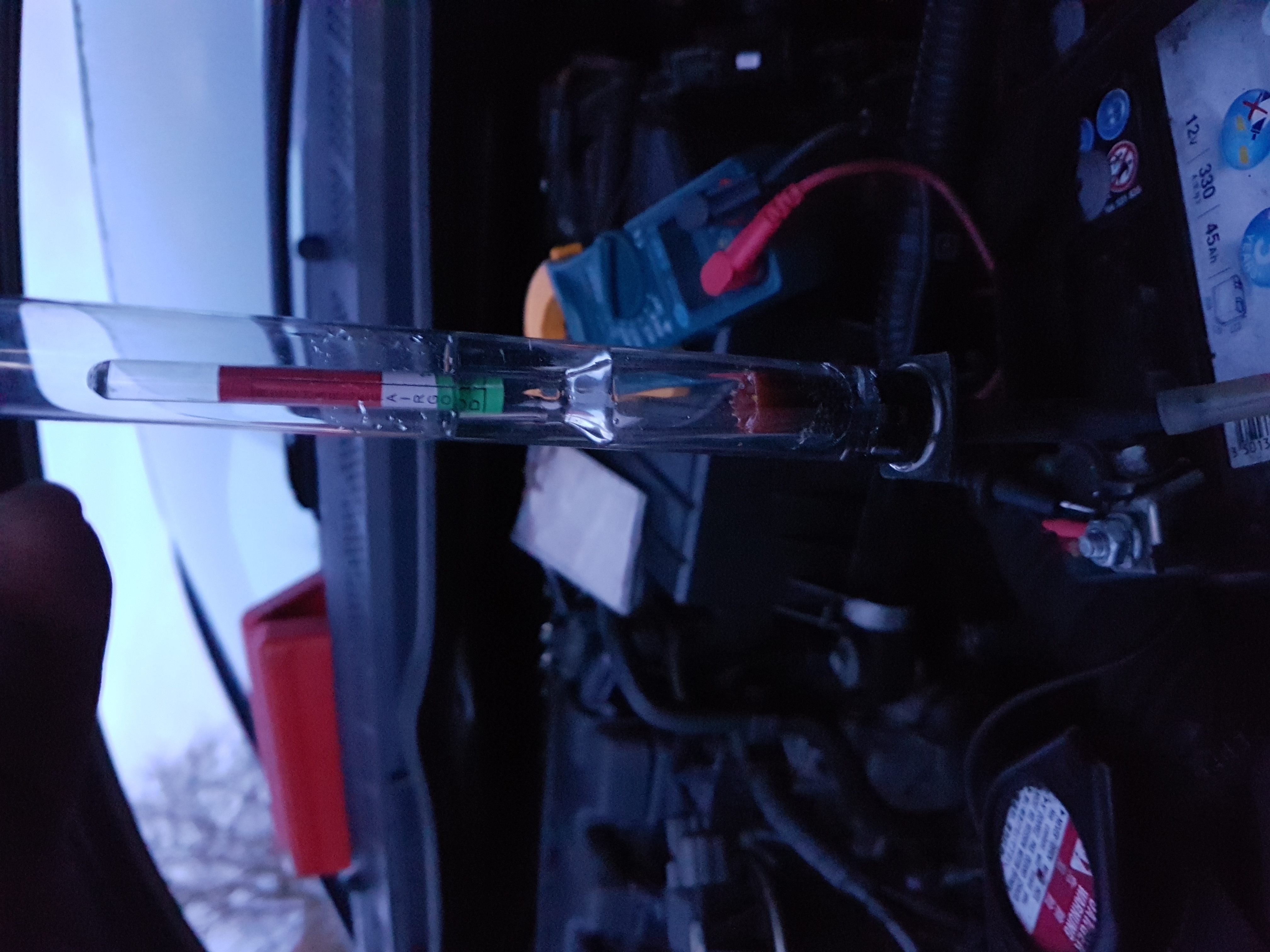 Pomiar napięcia na wyziębionym akumulatorze (auto nie odpalane od 15-u godzin) wykazało prawidłowe napięcie 12,6V natomiast z pomiaru gęstości nie jestem do końca zadowolony, bo pomimo iż poziom elektrolitu na skali "był na zielonym" to ze skali odczytałem odrobinę niższe watrości od prawidłowych.