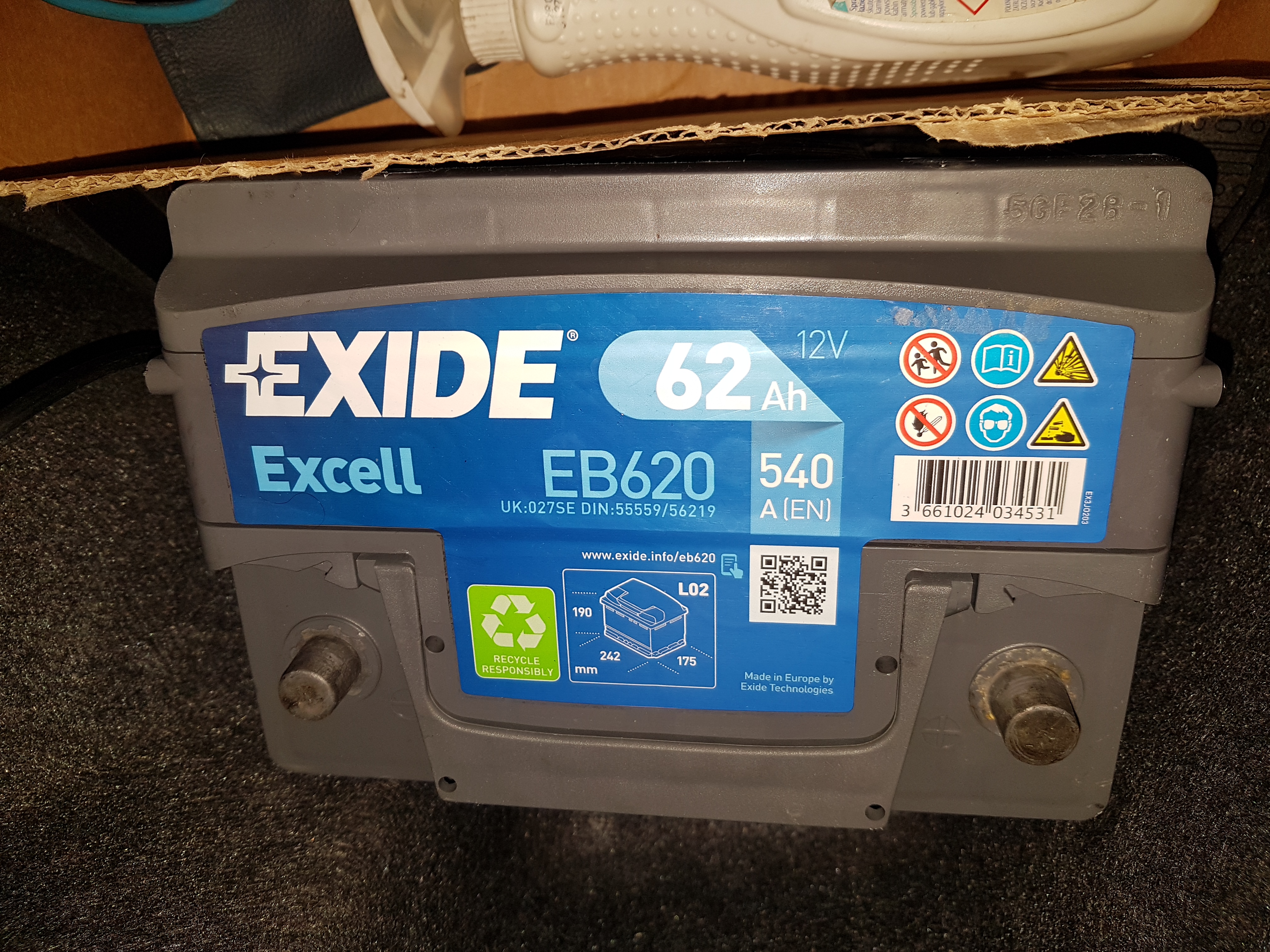 Po kontroli akumulatora, mając w świadomości niską gęstość elektrolitu postanowiłem nie czekać na apokalipsę i zawczasu wymieniłem bazową 45ah norautową baterię ( moim zdaniem Varta) na wcześniej doładowany produkt centra- Exide 62Ah, który kupiłem ponad 5lat wcześniej chyba jeszcze do mojego comprexa.