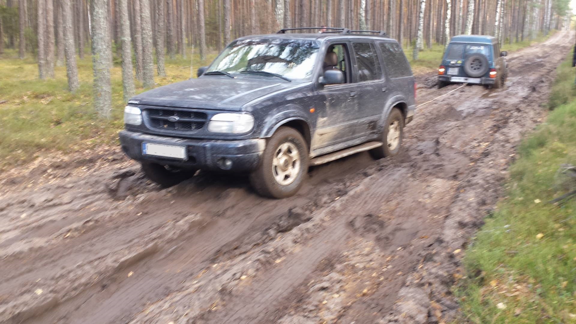 Generalnie tutaj błachostka, ale patrol po prostu zawisł dwoma mostami. Fajna droga, dalej mocno rozjeżdżona przez sprzęt do zwózki drewna. Koleiny miały nawet 0,5 a ja pełne gacie jadąc grzbietem – jakbym się zsunął (a miotało na boki na tych moich oponkach) to byłoby trochę roboty z wyciąganiem. Ale przyjemnie fordzisko śmiga, aż miło w takich terenach lekkich, potem trochę górek i podjazdów, ale bez ekstremów – czyli niedziela na relaxie.