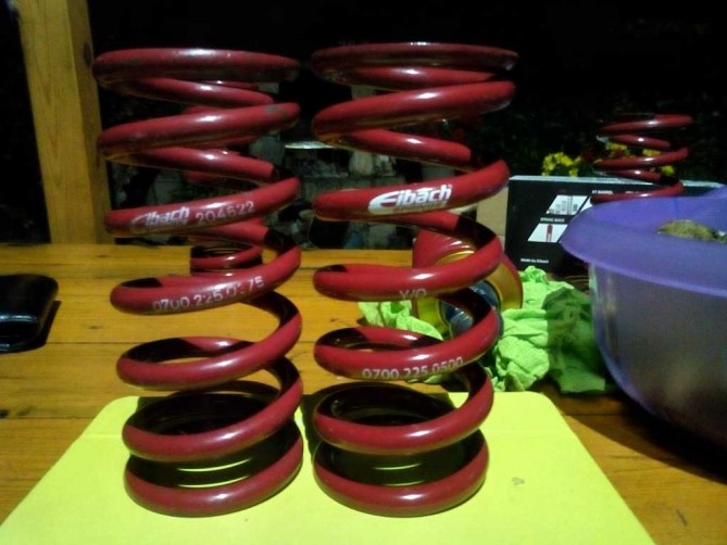Zakupiłem nowe sprezyny EIBACH'a twardościach przod 500lbs/in tył 600lbs/in. Seryjne przod 375lbs/in i [jakie?] 475lbs/in były na slicki duzo duzo za miękkie. Jutro możliwe że je założe i sprawdzę jak się spisują w sobote na Poznaniu:)