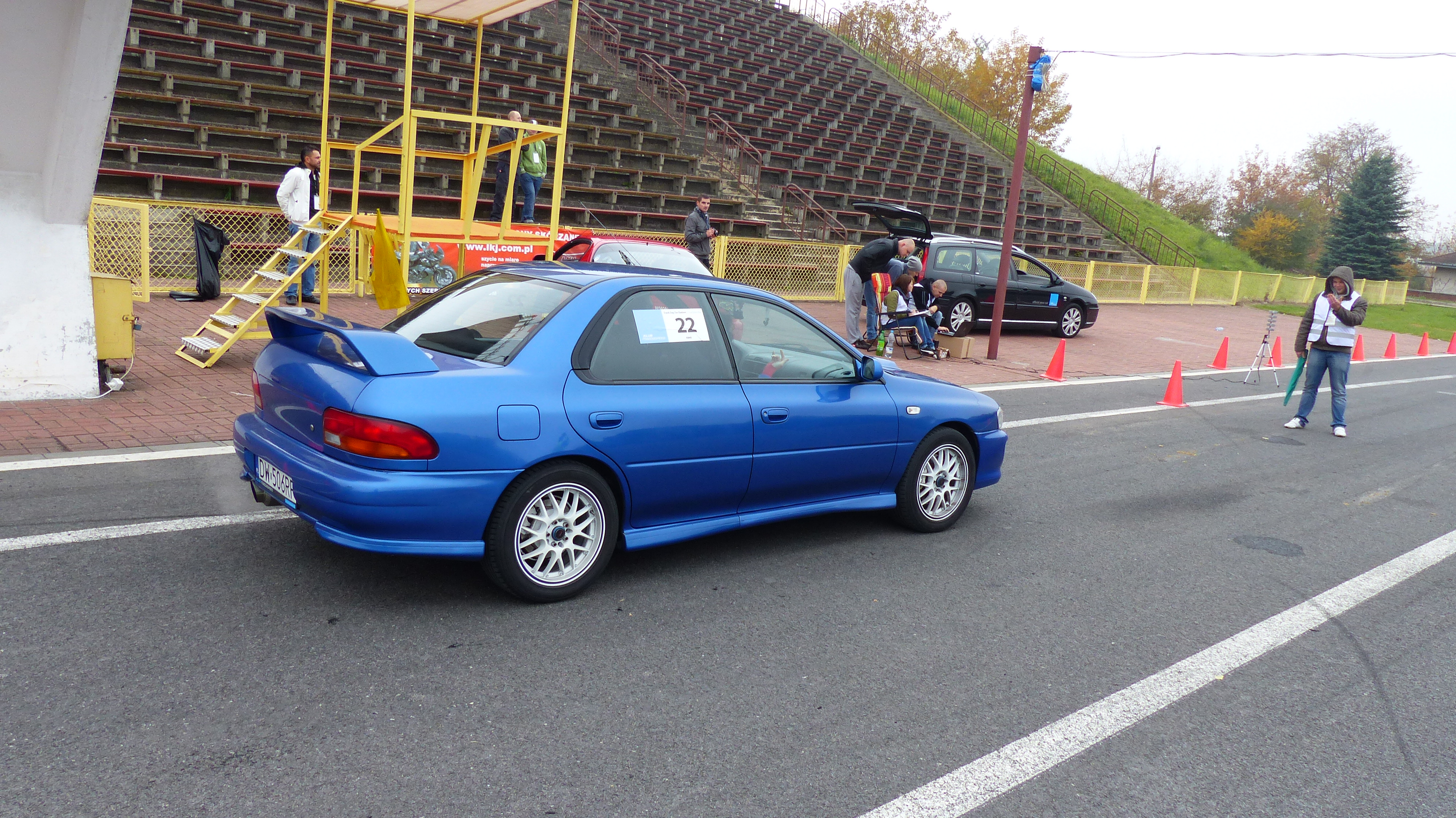 Dwie imprezy na białych felgach, a za nimi mazda na złotych