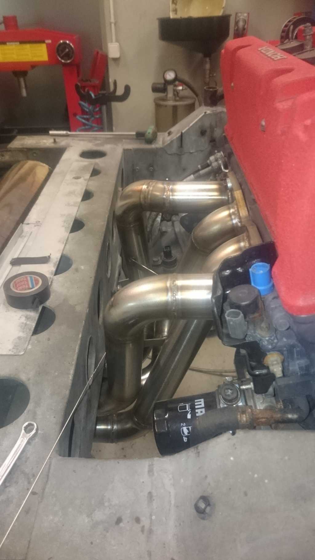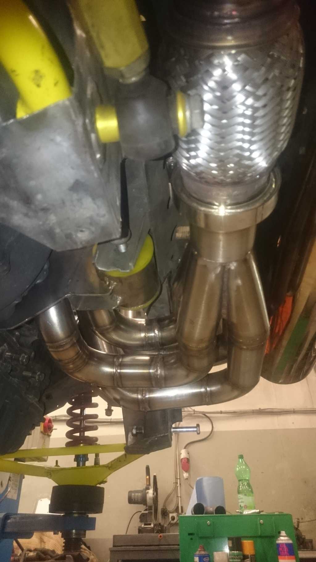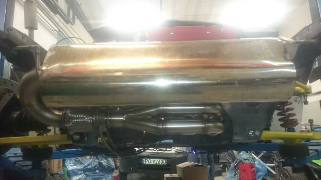 Wydech juz w 95% pospawany, moim zdaniem wyszlo genialnie. Wszystkie spawy były wykonywane w osłonie gazowej, wiec w srodku nie ma zadnych bobli wystających, ktore zakłócały by przepływ spalin ( jest to ułamek strat, ale ziarnko do ziarnka...). Katalizator udało sie zreanimować, wiec zostanie uzyty ponownie i będzie on umieszczony za tylnym tłumikiem, na samym koncu wydechu. Dodatkowo zakręt od plecionki do tłumika przelotowego bedzie o 63mm bliżej, a co za tym idzie nie będe musiał uzywać zadnych dystansów, aby mi nie spłoneła opona.... Oczywiście cały wydech będzie owinięty bandażem o gr 2mm, żeby ograniczyć emisję ciepła. Z plusów sonda lambda jest w koncu na wspolnej rurze, wiec afr bedzie z 4 cylindrów, a nie z 2 tak jak było dotychczas, pewnie AFR jakoś zbytnio sie nie zmieni, ale jest przynajmniej tak jak powinno być:) W katalizatorze zostaną wspawane 2 krócce na wejsciu i na wyjsciu, w razie badań technicznych na WSMP ( wkładaja druciki i sprawdzaja czy jest wkład w srodku, a nie sama puszka w innym wypadku musiałbym demontować cały wydech:) )