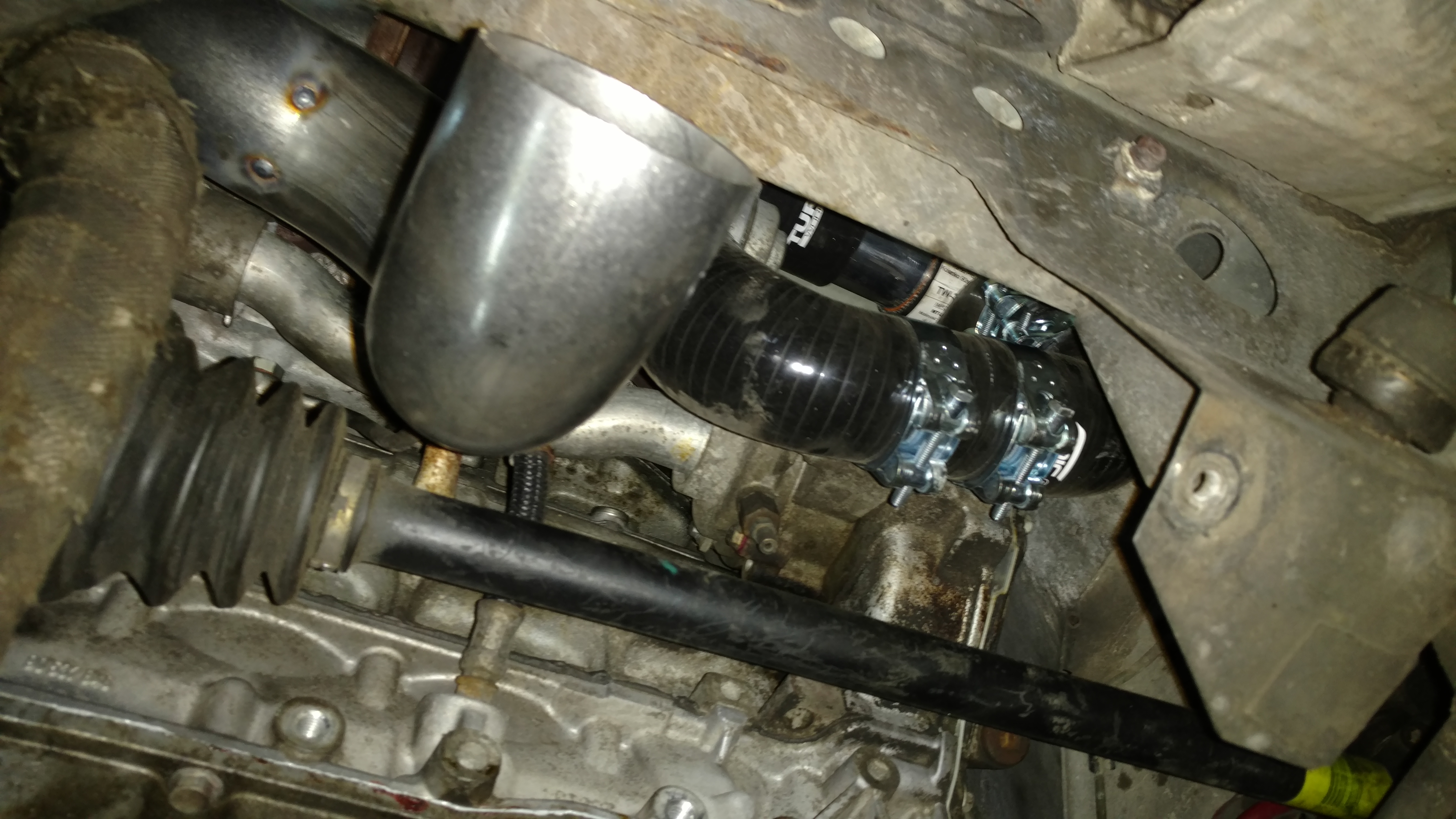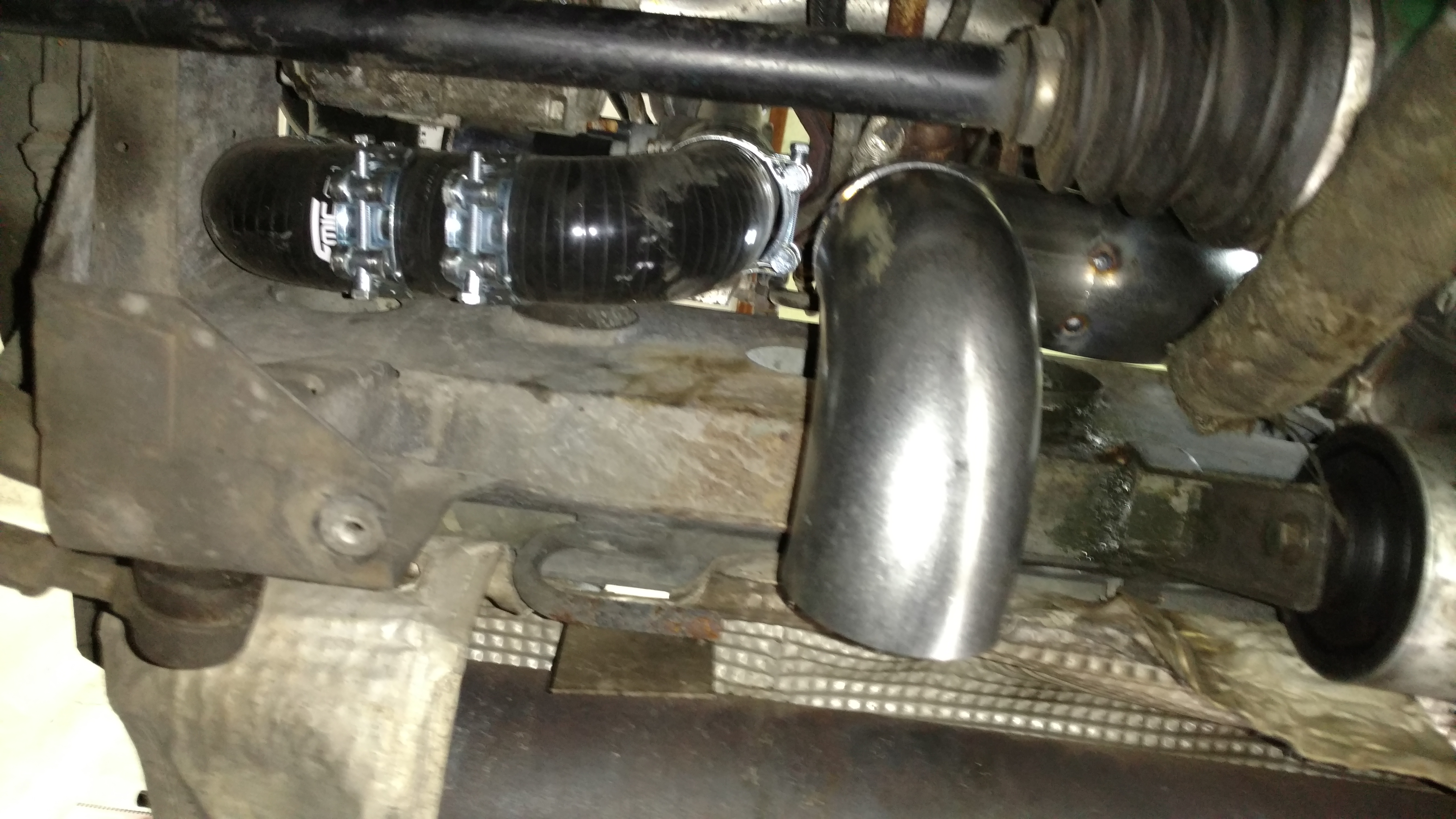 od turbiny do kata jest 3' (75mm) , kat ma 2,5' (63mm) , dalej za katem jest 50cm i wjescie na tlumik koncowy 50mm. icek bedzie lezaco jak na zdjeicach choc zdjecie pogladowe bo jeszcze nie zamocowany. to bylo jedyne rozsadne miejsce. i tak wybralem najmniejszy icek jaki byl dostepny w turboworks i go jeszcze musialem przyciac o jeden zwoj z kazdej strony. kolejna sprawa to jakosc plytki, ktora jest wewnatrz posrodku miedzy rurami wlotowa a wylotowa, rozdzielajacej powietrze wejsciowe od wyjsciowego w tym icku. normalnie dramat. przychewtowane wewnatrz icka w trzech punktach tak ze sa 3mm przeloty miedzy powietrzem goracym a zimnym i gorace powietrze zamiast przejsc przez caly icek i sie schlodzic idzie od razu na wyjscie bokiem. nie bede tego poprawial bo by bylo wiecej zabawy z tym ickiem (rozcinania spawania) ale troche kiepsko to wyglada.