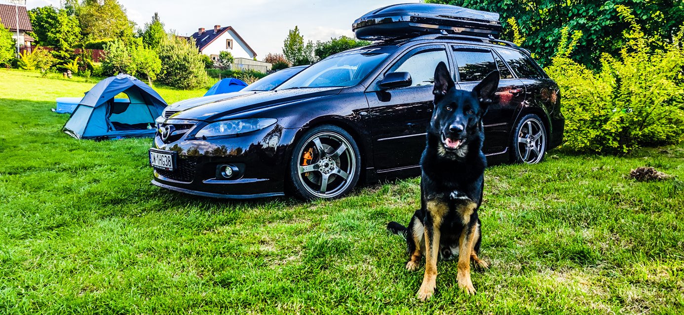 A tymczasem Mazda w wersji wakacyjnej z boxem dachowym Modula (pożyczonym od kolegi) zaliczyła wyjazd na Mazury z całą Naszą piątką i Loganem w bagażniku.