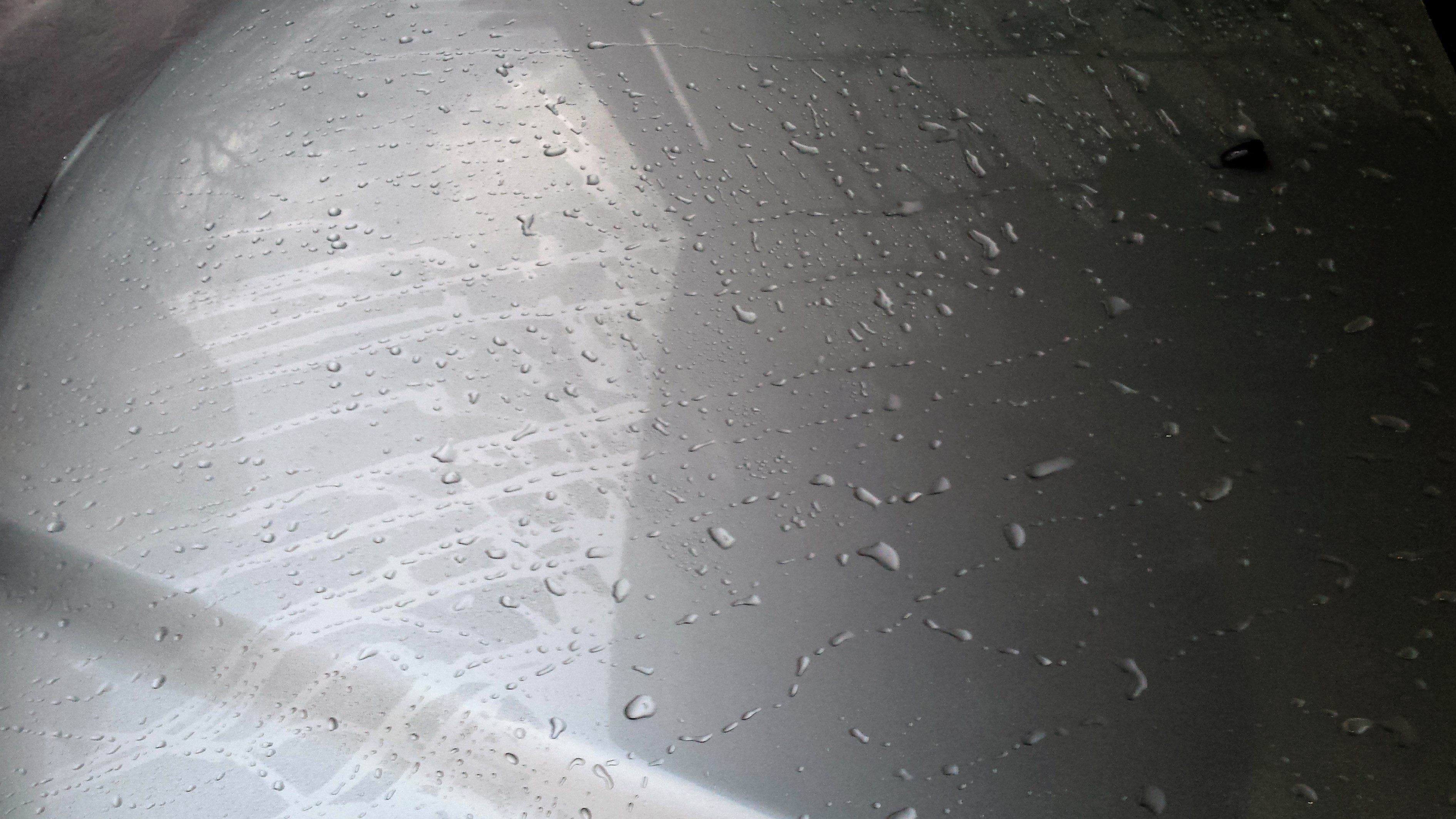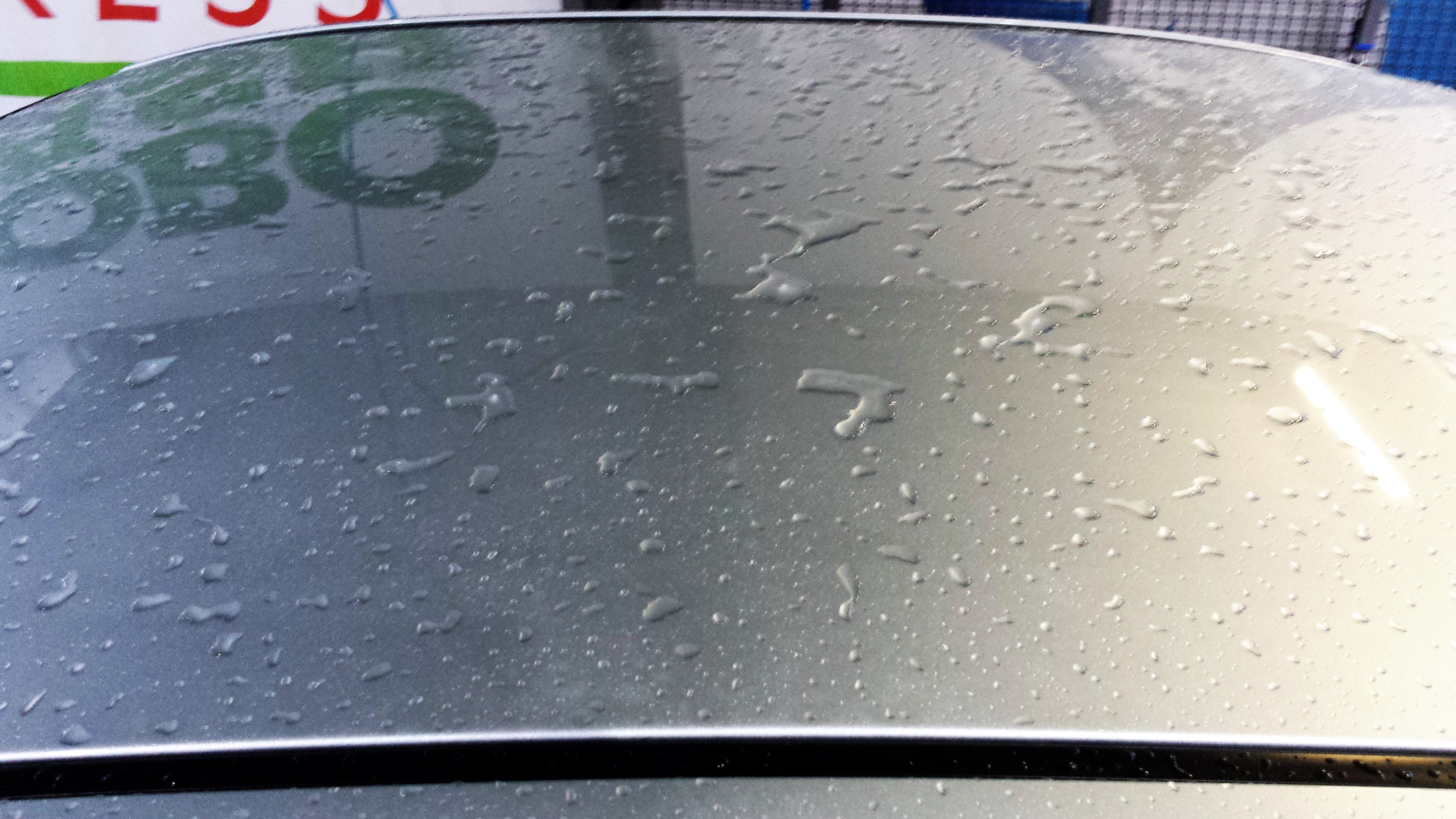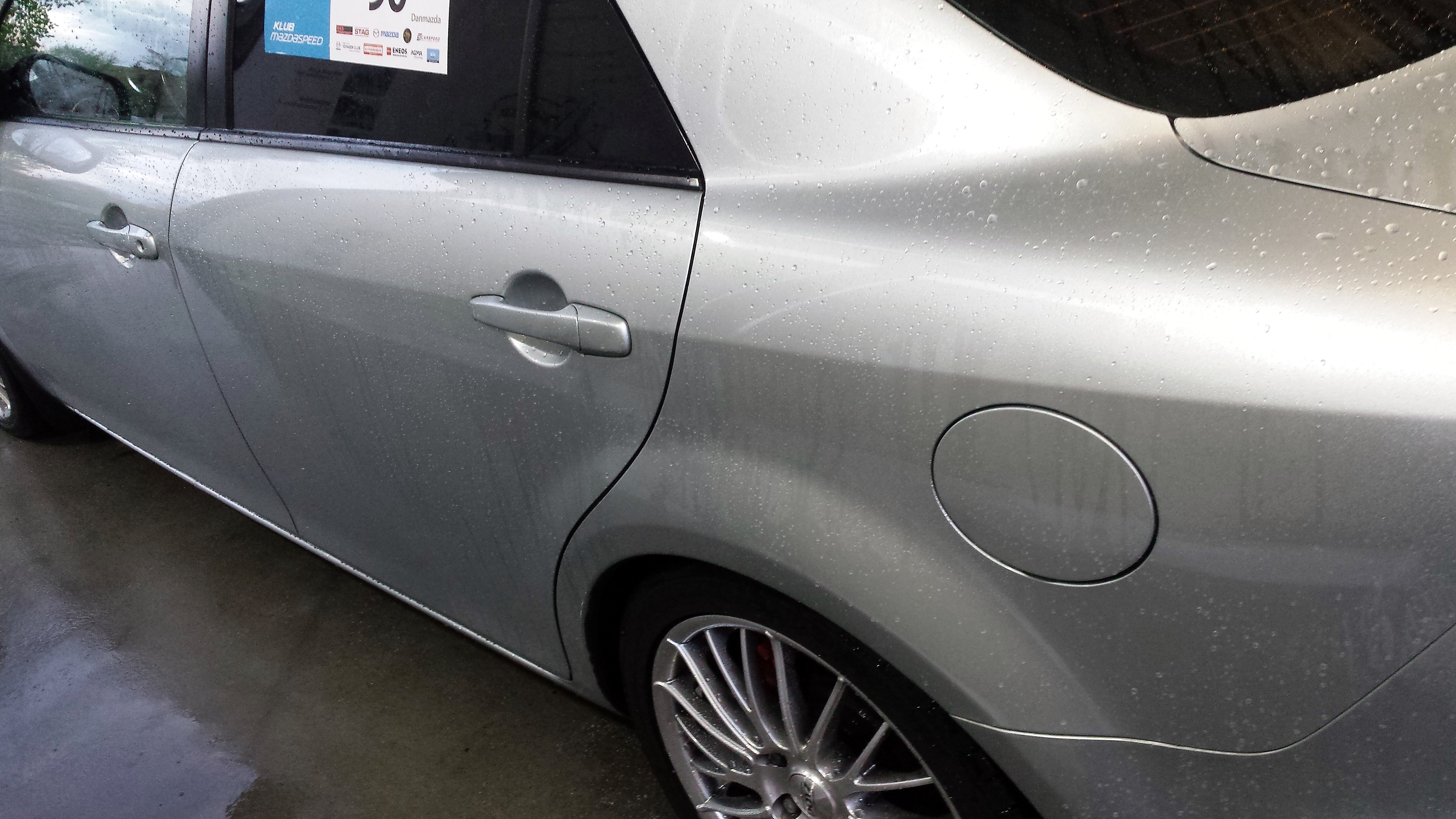 tanio i na szybko – Pure Paint Cleaner albo Paint Cleaner Plus (zdejmiesz nim wosk i przygotujesz jednocześnie lakier; wersja Plus ma delikatne właściwości ścierne). Tak zachowuje się woda przy jednej warstwie (widać nawet gdzie nie była do końca wypracowana, prawa część tylnej klapy):