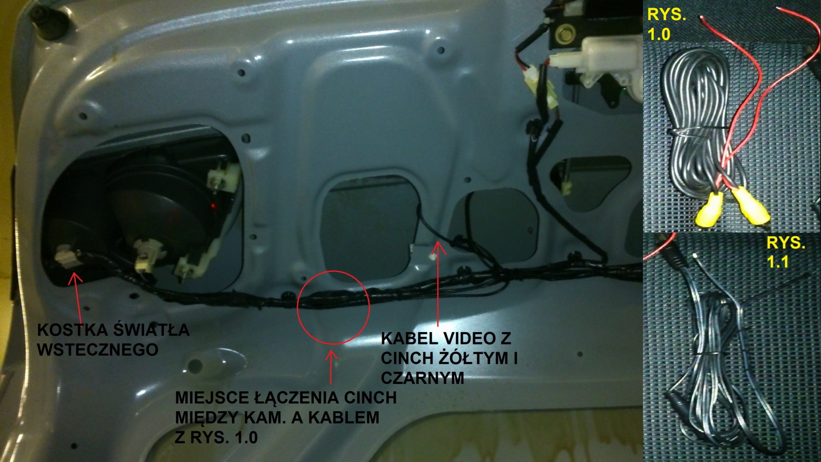Kolejną czynnością jest podłączenie zasilania kamery tak aby działała tylko przy wrzuconym wstecznym biegu i nie pobierała prądu, czyli pod żarówkę światła cofania. Do tego ma nam posłużyć przewód widoczny na (rys.1.0) I (1.1 są 2 takie same) Więc tak, łączymy cinche z rys.1.1 z kamerą cofania, czarny z czarnym. Do drugiego wejścia podłączamy odpowiednio żółty do żółtego, potem przewód czerwony łączymy z przewodem z rys.1.1 do czarnego z białą przerywaną linią, jest to przewód plusowy. Kiedy mamy złączone te przewody podłączamy je do kostki światła cofania pod plus a czarny pod minus i izolujemy taśmą. I tu możemy już zacząć porządkować przewody, łączenia cinch izolujemy. Wszystko można pospinać trytytką do kabli które biegną przez szkielet klapy.