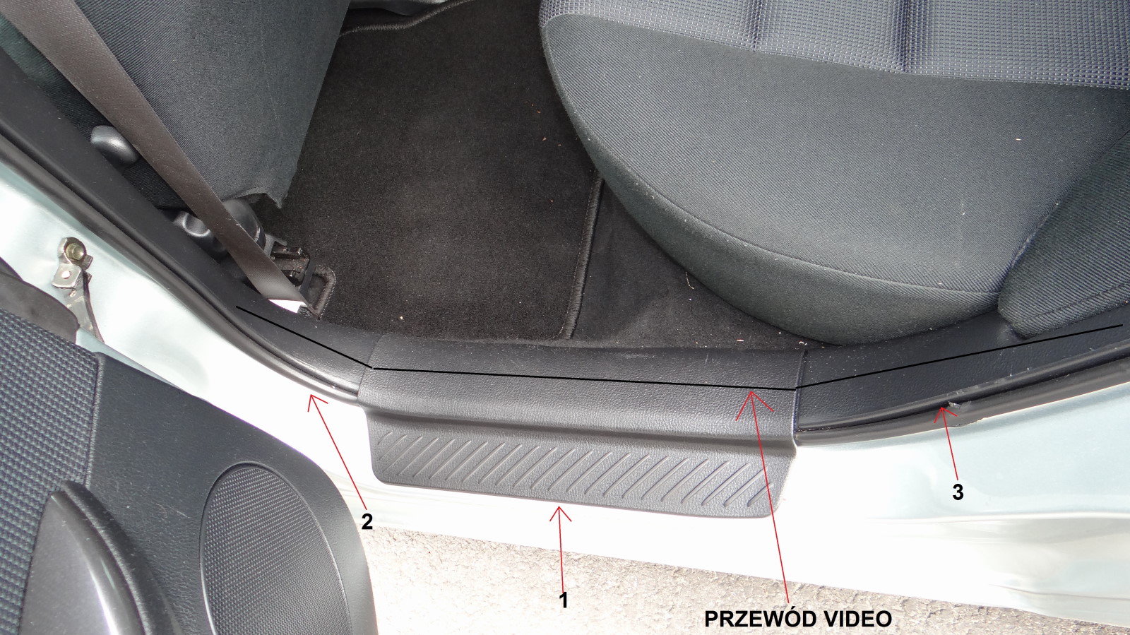 Teraz trzeba przeciągnąć przewód od klapy bagażnika do kabiny. Osobiście miałem z tym mały problem, chciałem go przełożyć wiązkę kabli w gumowej osłonie ale niestety było jeszcze zimno na dworze i dało się. Za izolowałem przewód i pociągnąłem go od spodu tej osłony i dalej przez bagażnik do kabiny. Wewnątrz auta trzeba zdemontować osłony progów według opisanej kolejności. (rys.6) i (rys.7) Wpuszczamy tam przewód, aż do skrzynki bezpieczników i dla bezpieczeństwa spinamy trytytką by się nie przemieszczał i nie przetarł.