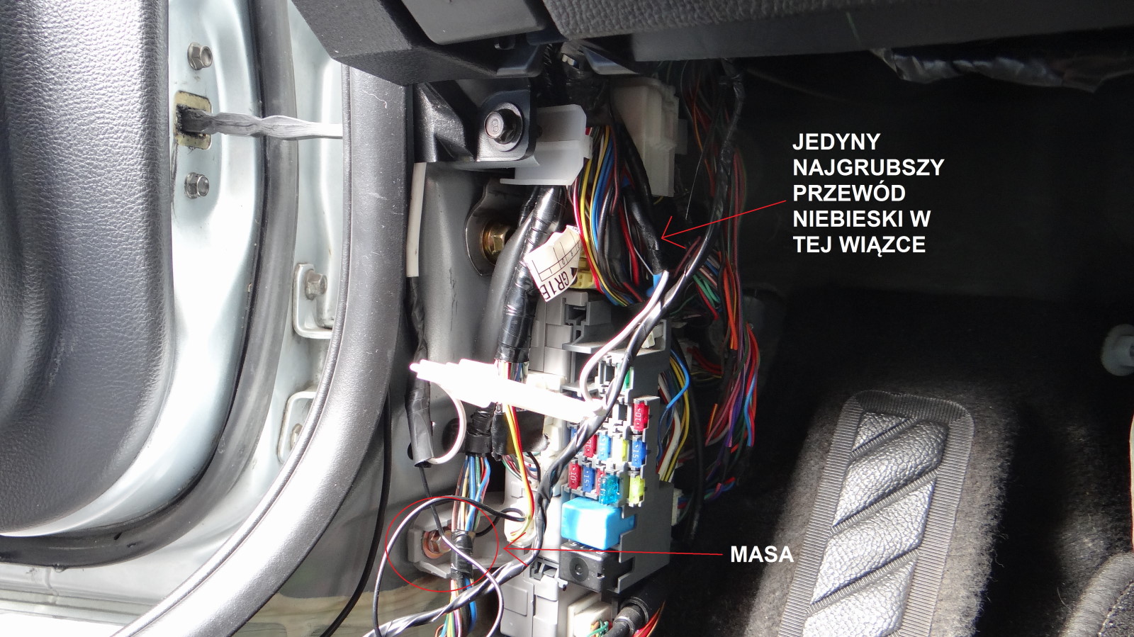 Jak mam już skrzynkę bezpieczników na wierzchu we wiązce szukamy grubego niebieskiego przewodu(taki jak na rys.8) Daję prąd po kluczyku. Rozcinamy koszulkę, i lutujemy przewód plusowy zakupiony wcześniej, teraz można go za izolować. Następną czynnością jest podłączenie masy. odkręcamy śrubę widoczną na rys.8 owijamy przewód i przykręcamy.