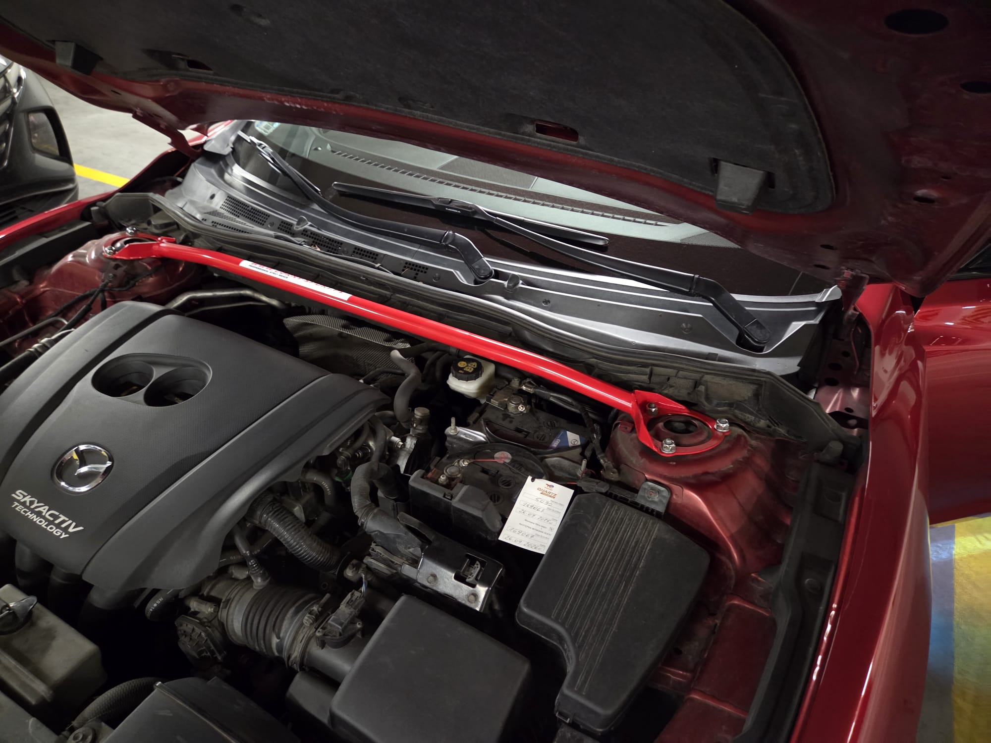 – swap hamulców przód na 320mm z cx-9 (tc). Wpadły więc nowe zaciski z jarzmem. Tarcze zamontowane od Zimmermana (sport coatz), klocki EBC żółte. Bezproblemowy montaż p'n'p. U mnie wymiana wynikała głównie z zajechania poprzedniego zestawu, a nie problemów z biciem tarcz, chociaż nie powiem, że nie irytowała mnie podatność na fading. Niemniej jednak wszystkim niezdecydowanym mającym problemy z 297mm polecam ten zabieg. Wleciały większe osłony za piasty (z CX-5), plus sprawiłem autu świeże łączniki staba (moog) i nowe łożyska od SKF, aby długo tam nie zaglądać…