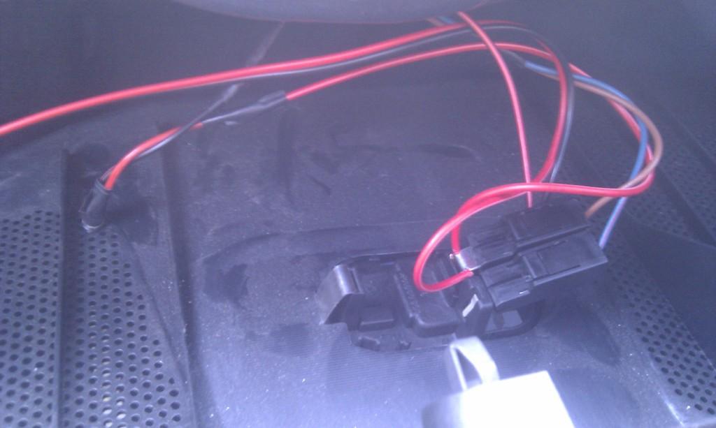Drugi kabelek do drugiej taśmy puszczony pod osłoną do zamka bagażnika, tą co znajduje się nad zderzakiem, potem już pod tapicerką i wychodzi na górze w dowolnym miejscu między plastikową osłona a tapicerką (nie chciałem wiercić dziur)