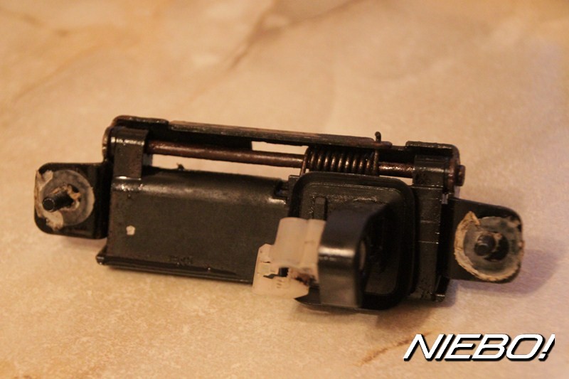 Otwieramy klapę. Wydobyć musimy uchwyt służący do zamykania. Po demontażu wygląda on tak – trzyma się w metalowej wnęce "górą i dołem" zaczepami widocznymi na zdjęciach. Operujemy delikatnie i z pewnością wyskoczy