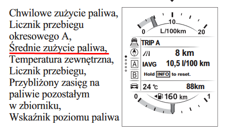 . Ale dotyczy to tylko nowego samochodu. A przy okazji, nie mogę rozszyfrować jednej ikonki która jest na wyświetlaczu. W trybie trip a, pod ikonką pasy ruchu jest symbol przypominający ø, a obok tego niebieska kreska. Co to oznacza?
