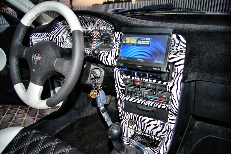 dziwnie, ale nie wygląda źle, natomiast kiepskie wykonanie, bo w wielu miejscach folia się pozwijała i źle siadła, ciężko się nakleja tą folię, ja 2 dni temu zmarnowałem chyba ze 3 metry ! Lepiej kupić oryginalne ciemne plastiki albo pomalować sprayem. poniżej foto jak jest u mnie: (popielniczkę też mam, ale nie ma na zdjęciu)