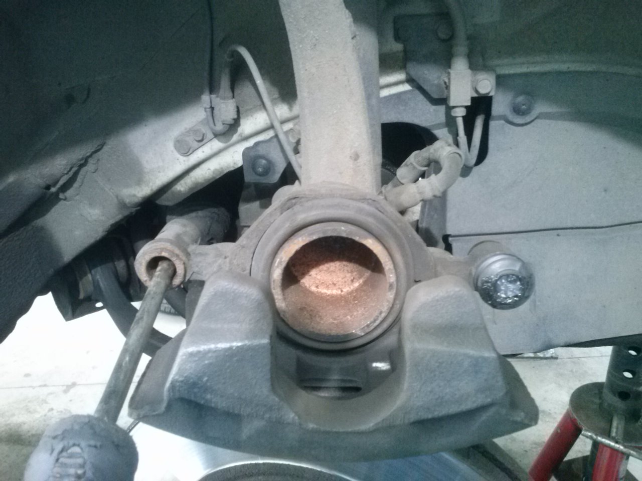 Odkopie troche temat ;) Mianowicie miesiac temu w aucie troche porobiłem rzeczy eksploatacyjnych ale nie było wolnego czasu by to opisac :P a wiec: 1)została nabita klima oraz przeprowadzone ozonowanie całego wnetrza, 2) wymienione klocki z przodu z wymiana srub i gumek w jarzmach (ktore jak widac były mocno sfatygowane przez co pojawiły sie problemy z grzaniem tarcz i piszczeniem przy hamowaniu) – auto po tym zabiegu hamuje idealnie i cichutko :) 3) ustawiona została juz finalnie geometria po wymianie i "ułozeniu się" wymienianych elementow zawieszenia, 4) założyłem przy okazji wreszcie rozporke.