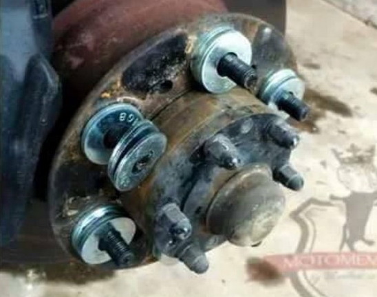 Fakt, że koło siedzi głebiej, ale trudno. Przy dystansach 10-15 trzeba już wymieniać szpilki, bo mało gwintu w nakrętce będzie. Przy większych dystansach to już może gdzieś przycierać.