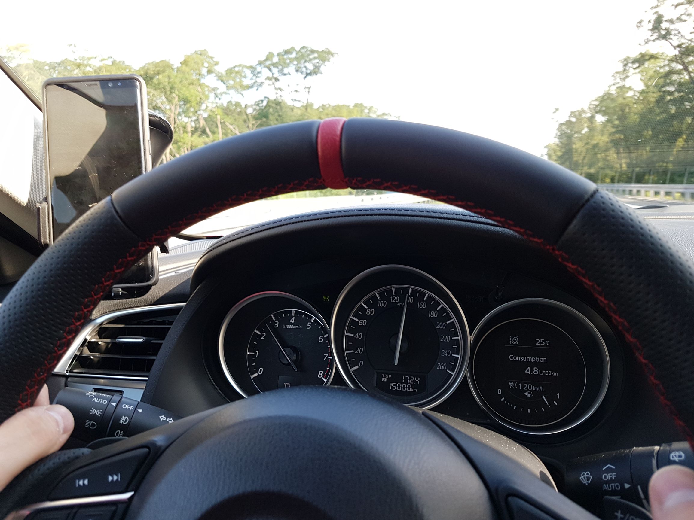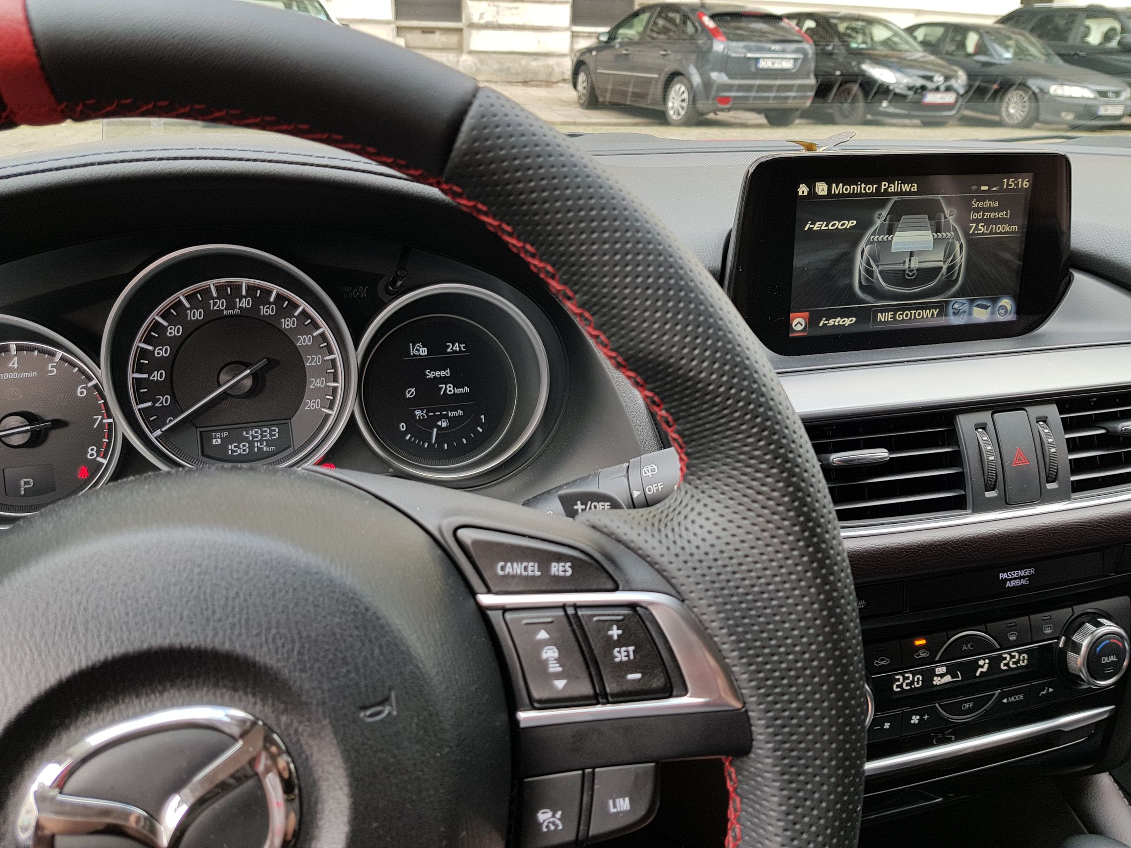 Obszyta kierownica jest doskonała (bo rozumiem, że o to pytałeś). Pierwszy raz od kiedy mam Mazdę ręce nie lepiły mi się do obręczy (wliczając w ten czas Mazdę 3). Idealny komfort, pewny chwyt. Także super. A no i jeszcze śladu na kierownicy nie ma, gdzie przy nowym aucie po wakacjach już lewa część była bardziej błyszcząca (żeby nie było – myję ręce często, nie używam żadnych kremów). Kierownica "skórzana" w aucie za 150 tysi to kpina...