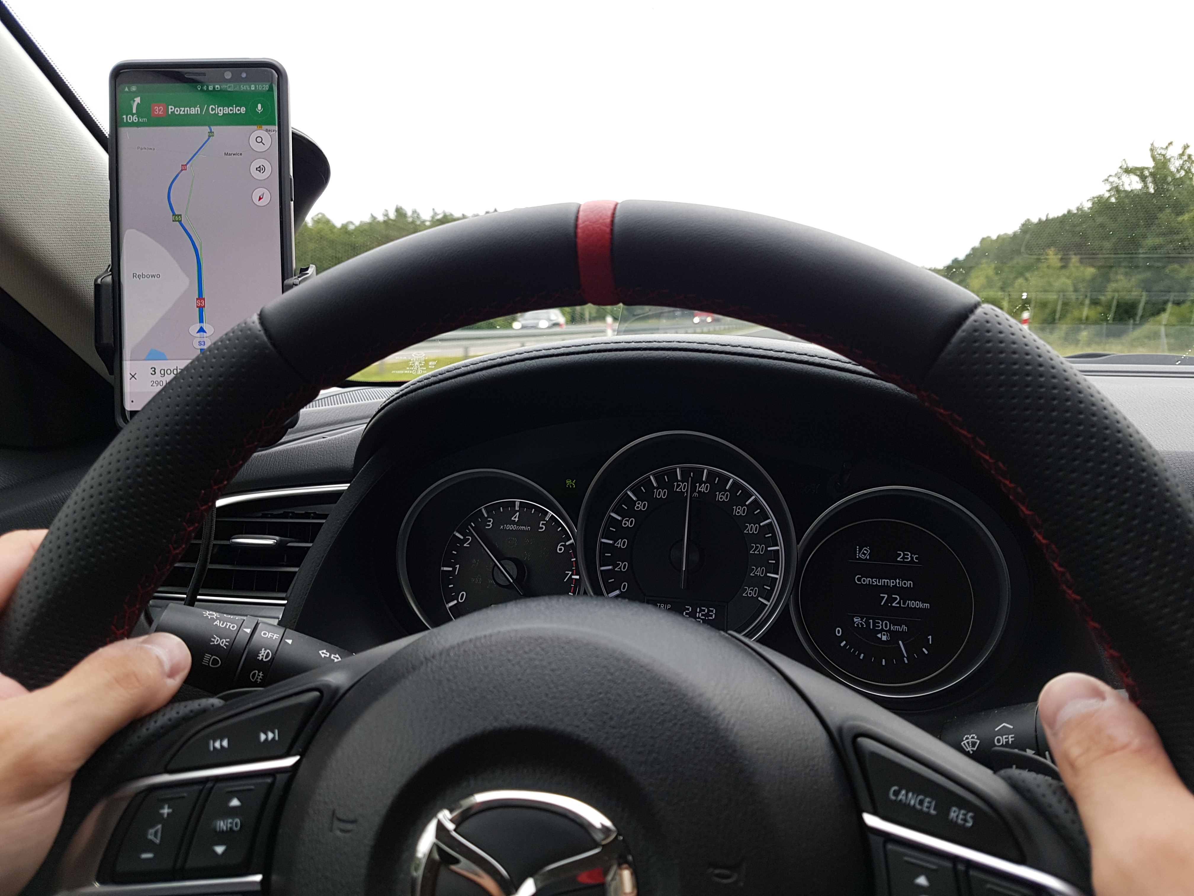 Mazd po drodze za dużo nie wdziałem, choć jadąc nad morze przez kilkadziesiąt km jechałem razem z inną czerwoną kombi... Tempo było bardzo duże, więc po półgodzinnym sprincie, który podniósł średnią spalania dobrze ponad 8 litrów wróciłem do swojego tempa (czyli przepisy + 10-15kph). Zrzucę film z rejestratora.
