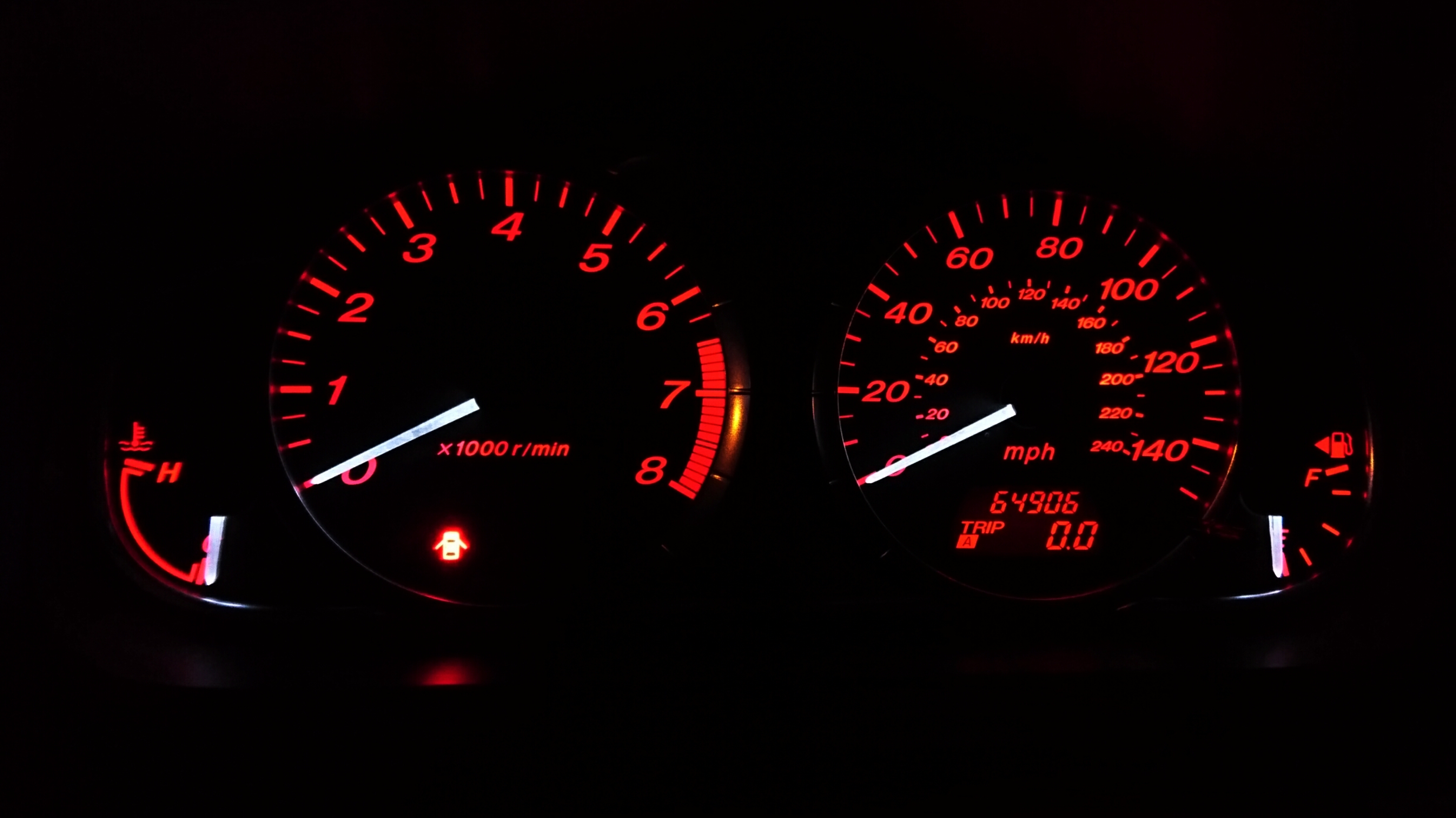 Póki co listwy jeszcze na aucie. Za bardzo wieje wiatr by wygodnie ściągać klej z drzwi. Jutro albo pojutrze powalczę jeśli warunki będą na to pozwalały. Za to wpadł oryginalny licznik. Ten od MPSa liczył spalanie i przebieg w kilometrach chociaż wszystko było podane w milach i litrach/100km. Żeby nie było nudno to w oryginalnym liczniku zmieniłem podświetlenie zegarów z czerwonego na... czerwony. Oryginalne LEDy są mało czerwone (chyba jakieś malinowe chociaż na kolorach to się nie znam <lol>) więc wymieniłem je na prawdziwe czerwone. Czekam na noc i zobaczę czy jest jakaś różnica. :D
