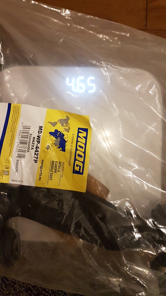 12.02.2022 – wymiana obydwu przednich, dolnych wahaczy. Od jakiegoś czasu coś stukało przy ruszaniu, szczególnie na skręconych kołach i czasem przy wjeżdżaniu w dziury. Podjechałem na lubianą SKP i panowie stwierdzili, że to już luźne tuleje tylne wahacza przedniego. Ok. Biłem się z myślami – dawać komuś, robić samemu? Same tuleje czy całe wahacze? Padło na całe wahacze. Kpiłem moogi, ale z 2 godziny po zakupie trafiłem na pewien filmik, gdzie gość zrobił porównanie wahaczy mooga i lemfordera, zdaje się, że z jakiejś hondy.... Moog to dramat. Więc szybko zamówiłem lemfordery właśnie. Przyszły, porównałem organoleptycznie – moog już miejscami rdzewiał. Ponadto ważyły 300g mniej niż lemfordery. Pomiar suwmiarką wykazał mniejszą grubość ramienia...