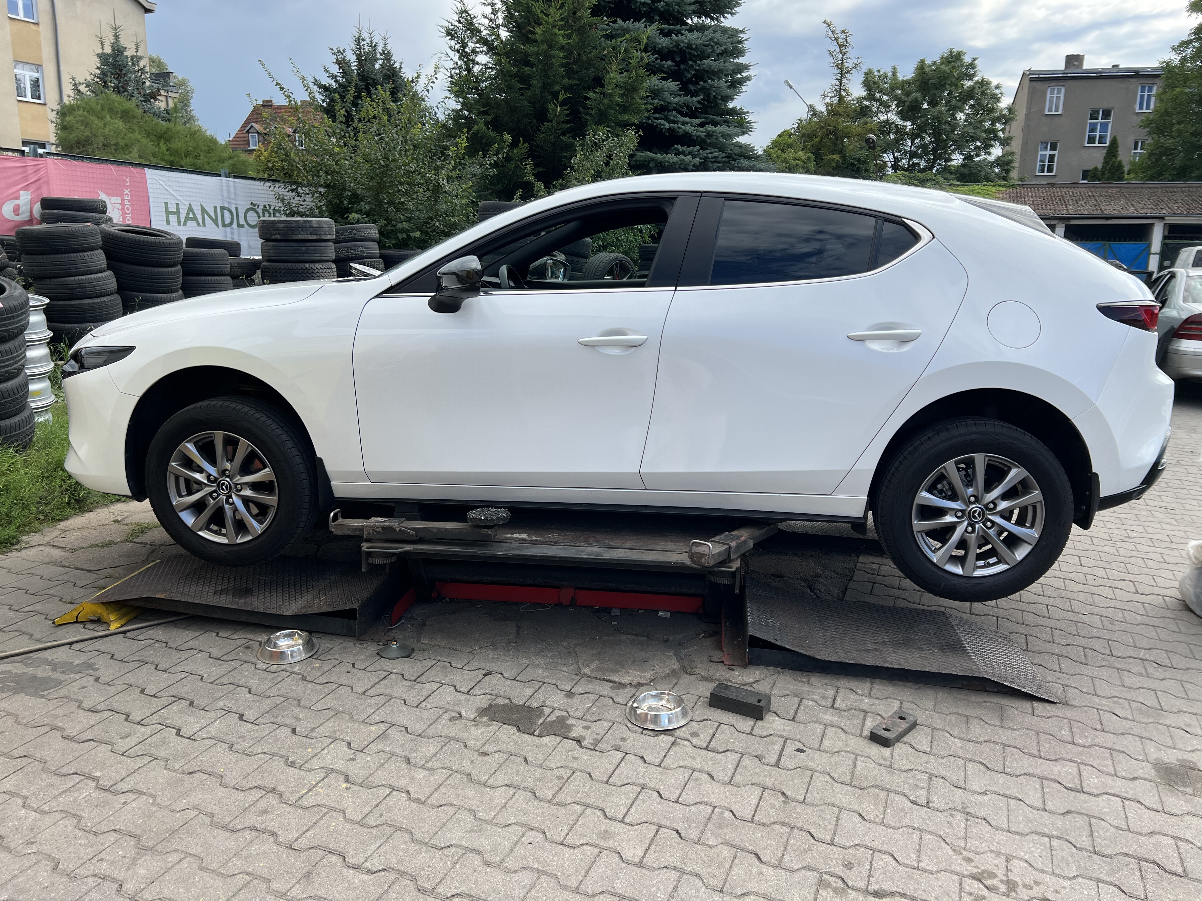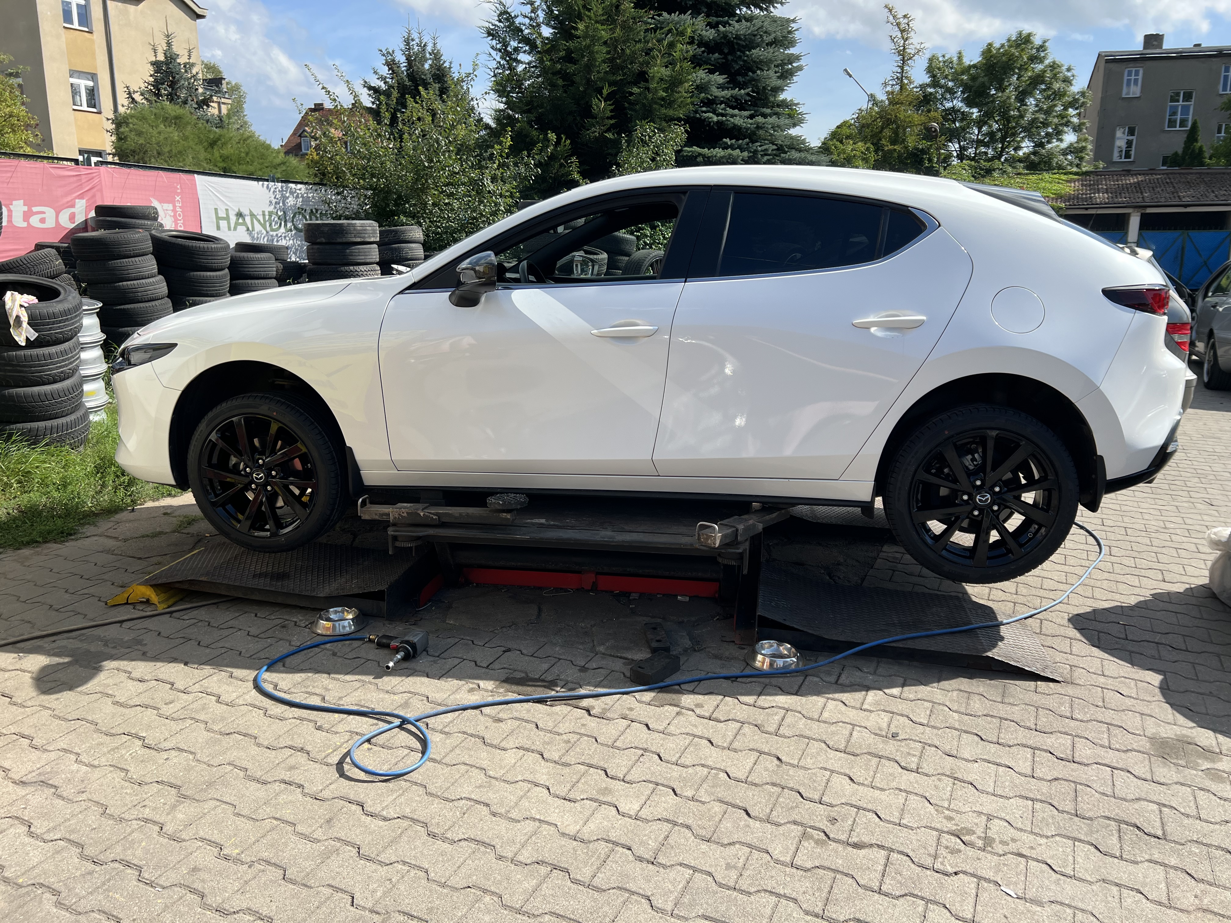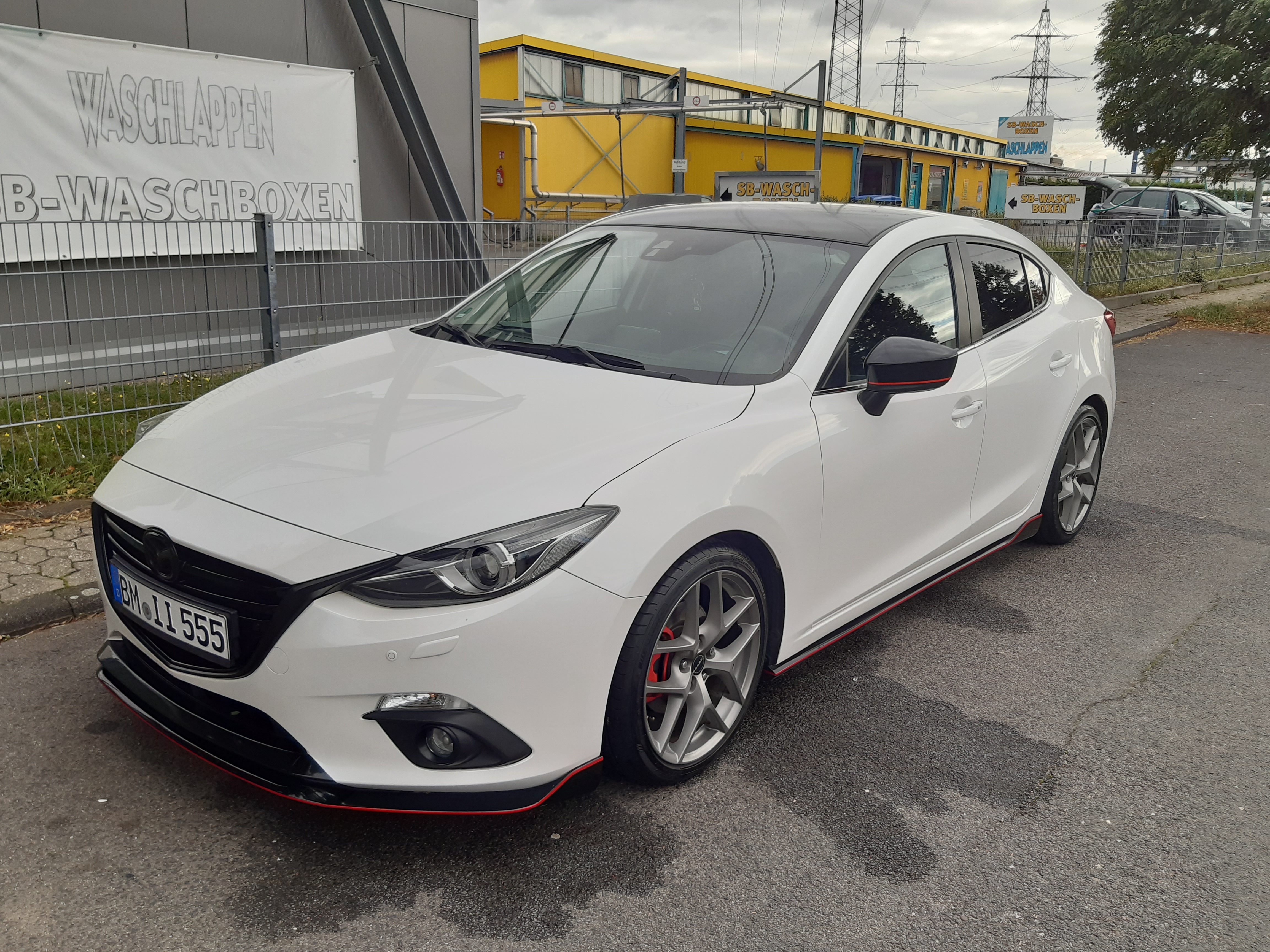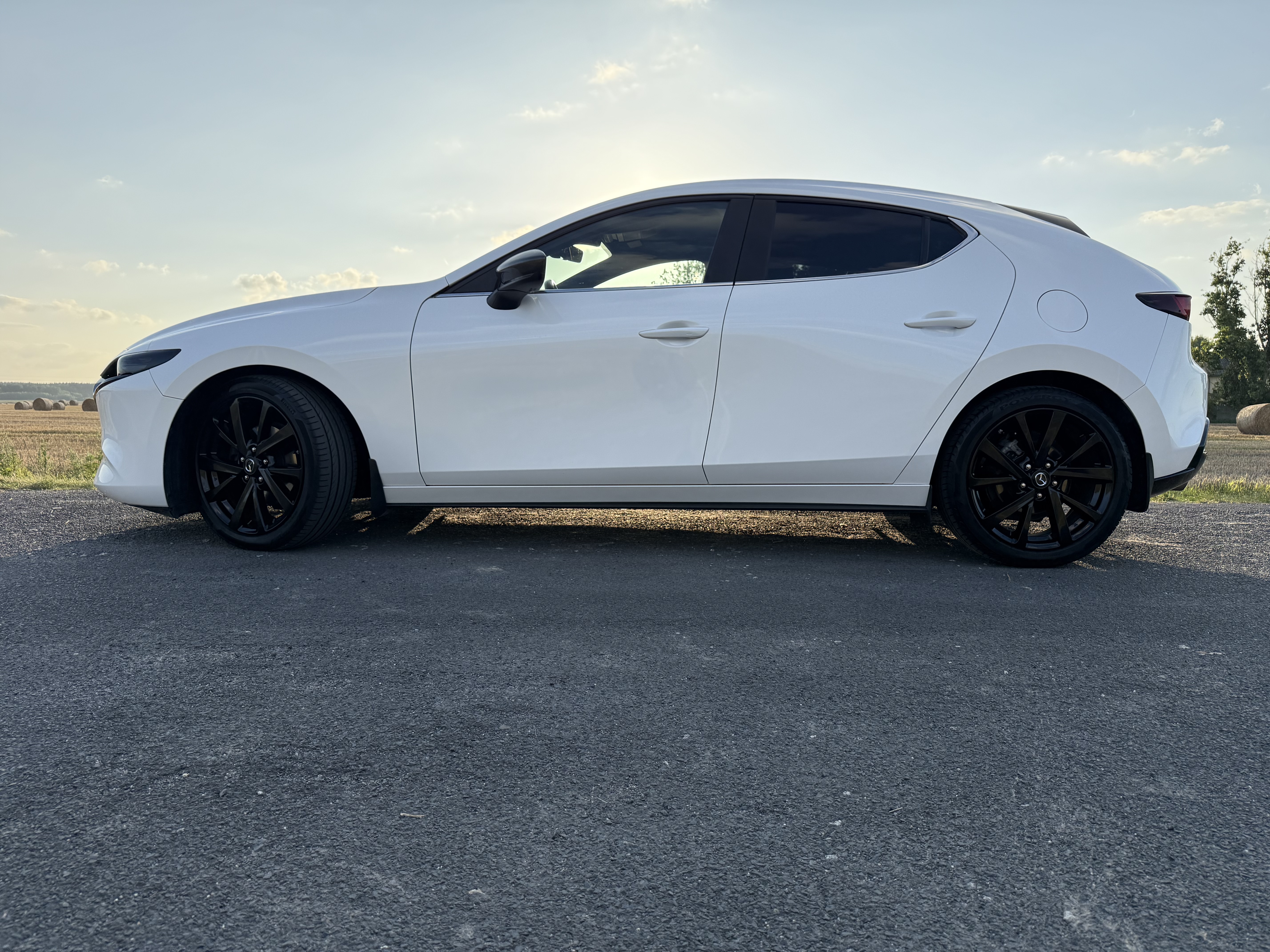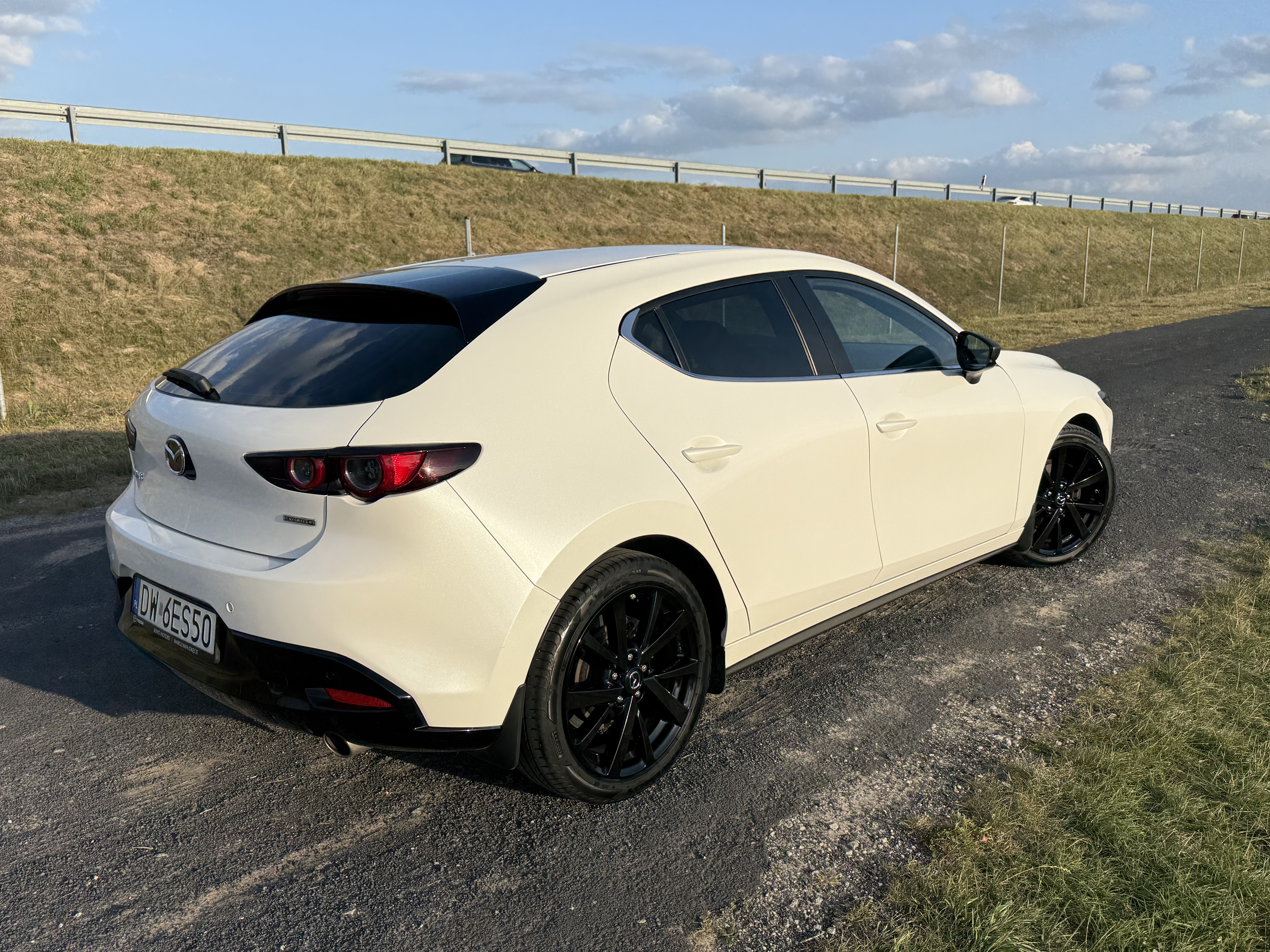 Gratulacje ładnego autka,chciałbym też napisać swoją opinie,czarny dach jak najbardziej na tak,z tymi czarnymi felgami to jest efekt jak felga jest duża,moim skromnym zdaniem czarna zawsze będzie wyglądała na mniejszą i jakoś tak jest mniej wyrazistą,z klapy usunąłbym napisy,lub pomalował napis Mazda 3 na czarno,a skyactive usunął, felgi dał titan matt – elegancko pasuja do białego ,fotka białej co prawda BM,ale z czarnym dachem i titan matt felgami