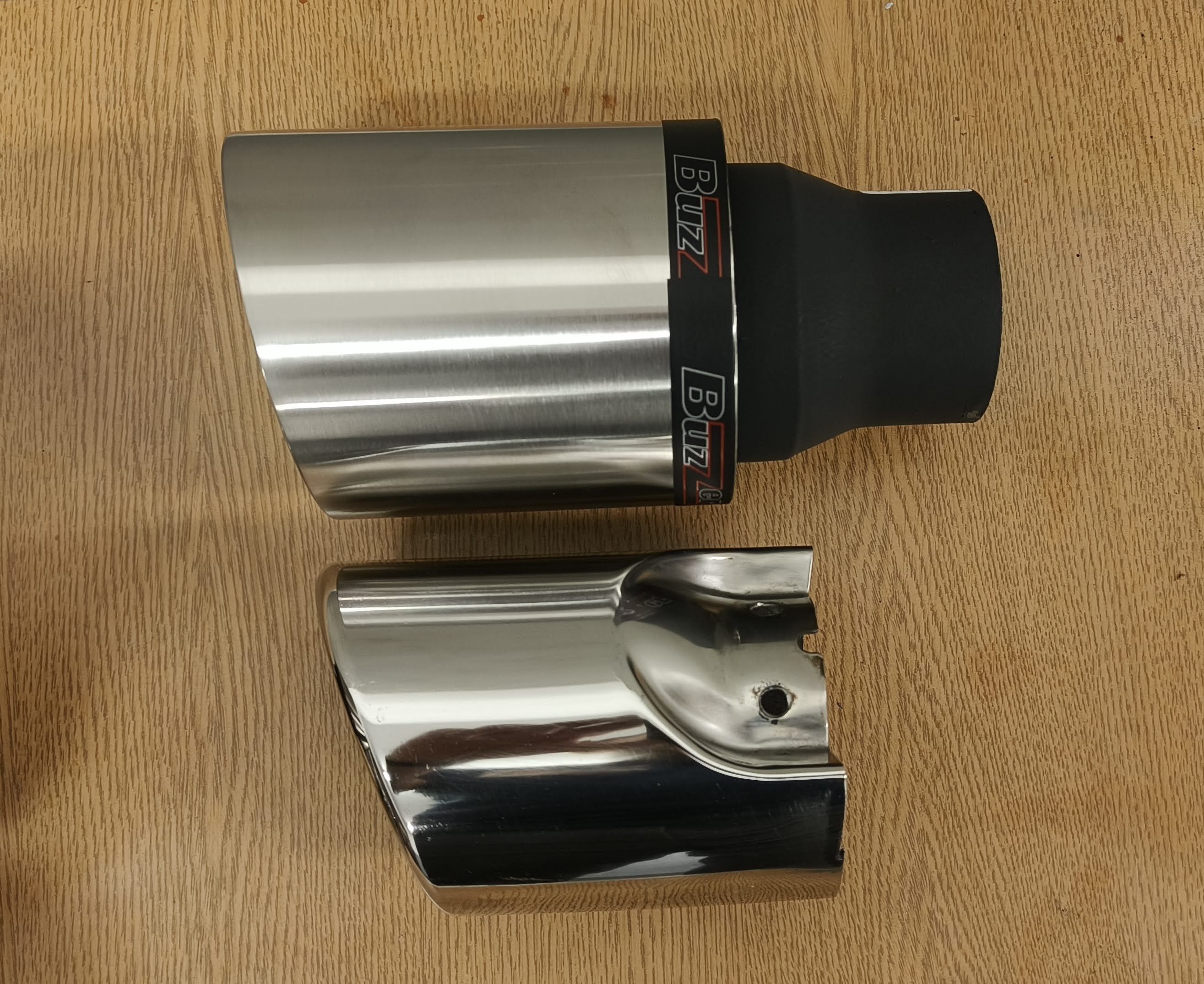 Do montażu również przygotowany odświeżony w całości układ wydechowy i wszystkie osłony termiczne. W miejscach gdzie korozja zjadła trochę uszy do mocowań z blachy aluminiowej przygotowałem podkładki wzmacniające materiał. Końcówki fabryczne obcięte – same chromy nie wyglądały źle ale końcówka rury do której były przymocowane już była tragiczna. Zamówione nowe BUZZERY fi100mm, takie same jak mam w BN – na zdjęciu porównanie do ori fi90mm.