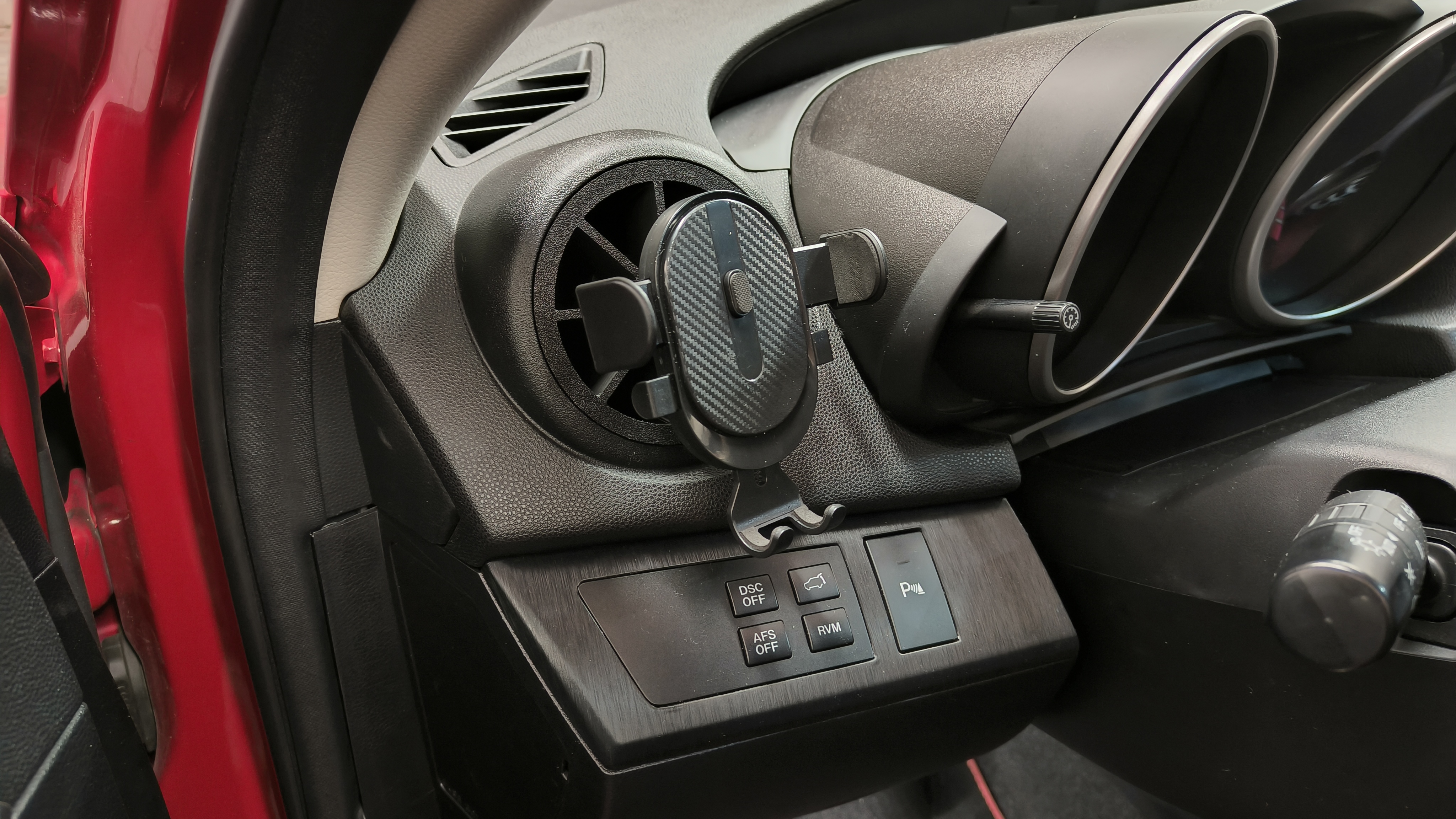 Z kolejnych brakujących mi rzeczy przydałaby się kamerka wideorejestrator. Jako że mam stację multimedialną z Androidem odkryłem że można sobie kamerkę taką podłączyć przez USB i wyświetlać i zarządzać na ekranie. Kupiłem coś najprostszego, ale nawet nienajgorsza jakość tego wynalazku za 80 ziko. Niestety nie mogłem patrzeć na odpustowe wykończenie więc kolejny raz drukarka 3D w ruch poszła – efekt prawie jak fabryka.