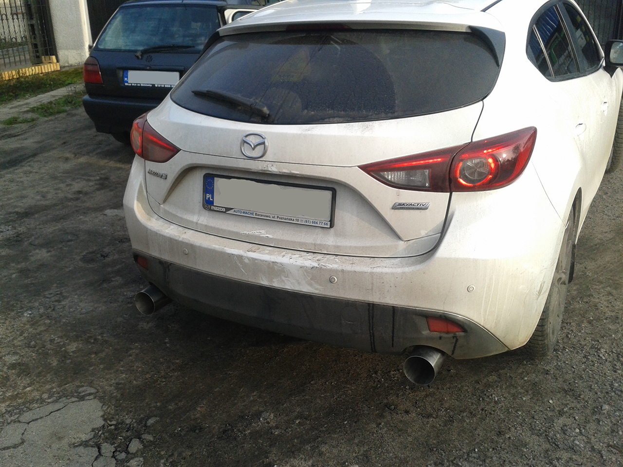 Odkopię temat kół i dystansów. Od pewnego czasu chodzą mi po głowie pewne felgi, po kalkulacjach szerokość/et będą wystawać o 17mm więcej niż seryjne 18". Ty masz 22mm więc całkiem niedaleko. Mógłbym Ciebie prosić o kilka zdjęć jak na poniższym przykładzie? Z tyłu i przodu (na wyprostowanych kołach) oraz gdzieś z okolic drzwi patrząc na przód. Poniższe zdjęcie to moja stara 6, na 1szy rzut oka było OK, ale po latach piaskowania progu jego przednia część zgniła kompletnie. A właśnie tego chciałbym uniknąć w 3... Dzięki
