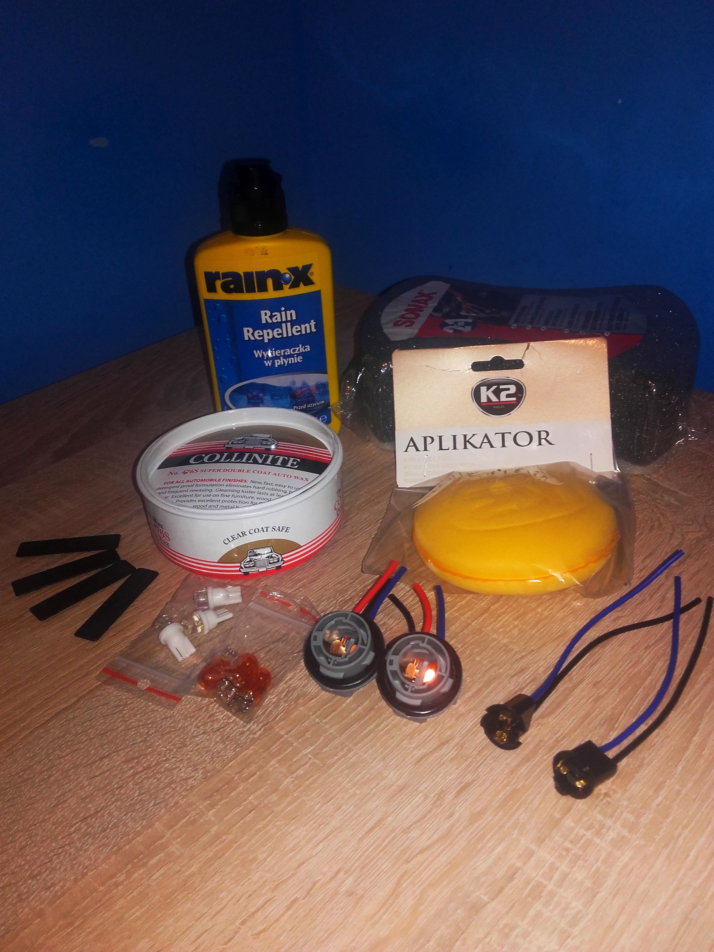 Co prawda przy aucie nic się nie dzieje ale powoli się zbroimy... Skompletowałem już prawie wszystko do obrysówek (brakuje mi tylko żarówek na przód, bo nie mieli akurat na stanie). Do tego zakupiony został komplet nowych zaślepek relingów, bo na moje dotychczasowe ktoś się połasił (tym razem je wkleję, bo i tak nie przewiduję montażu bagażnika dachowego). Powoli kompletuję też zestaw do ogarnięcia nadwozia wiosną. Wybór padł na wosk Collinite 476, do tego na szyby niewidzialna wycieraczka Rain-X. Do zestawu brakuje jeszcze glinki, jakiegoś cleanera i pasty do korekty (najprawdopodobniej padnie na Menzernę).