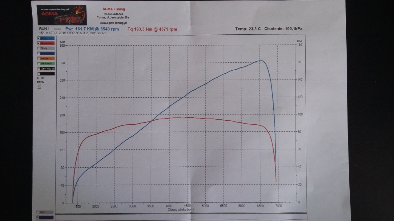 mazda po hamowni w Rykach – jak widać silnik nie trzyma fabrycznej mocy.