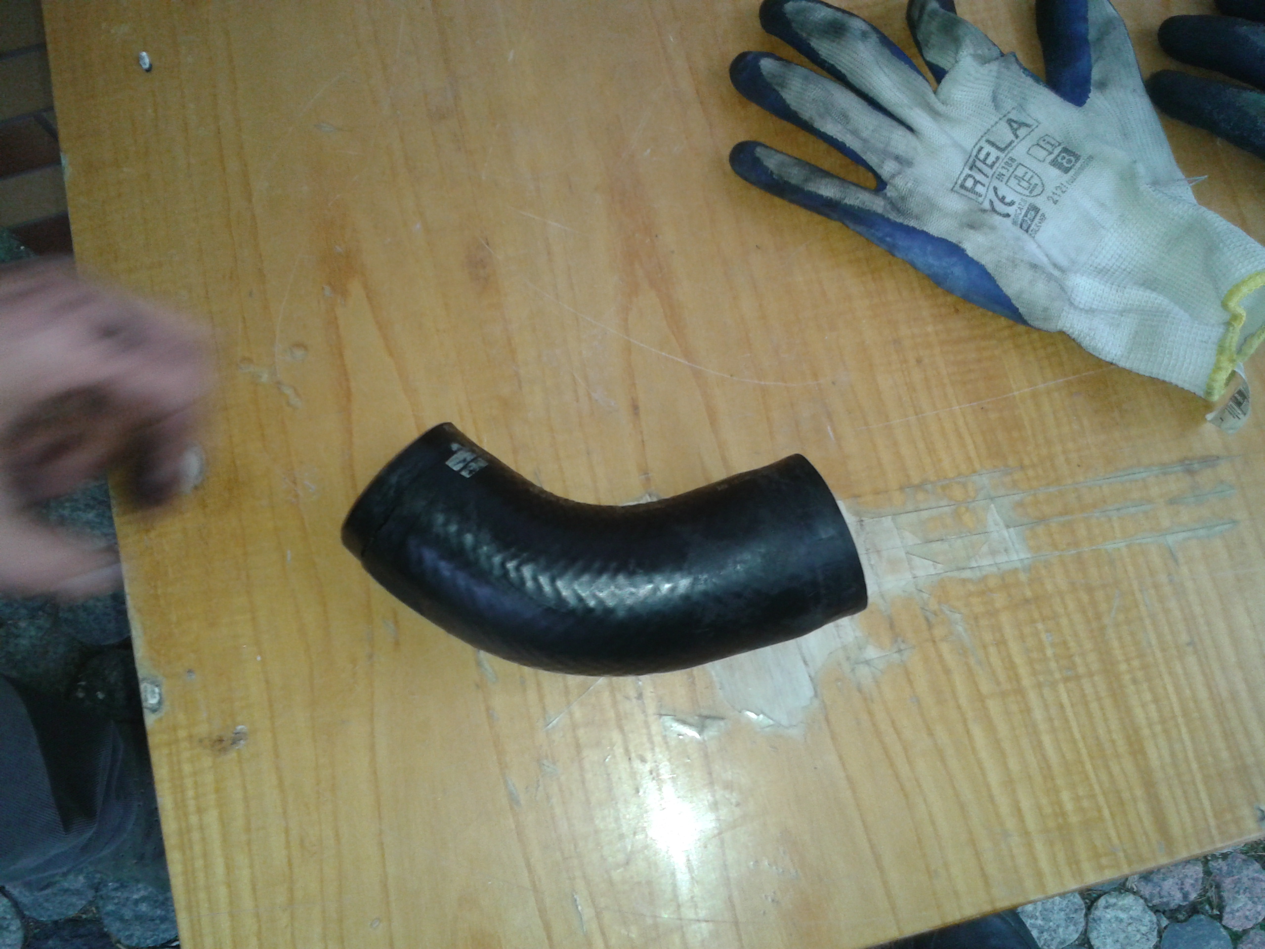 No i teraz problem: od jakiegoś czasu zaniepokoił mnie nalot z oleju w okolicy bagnetu. Mechanik miał się tym zająć przy wymianie płynów (za ok 2 tygodnie). Ale dziś zauważyłem rozerwanie rury w okolicy obejmy od dołu. Po rozkręceniu i odwróceniu rury udało sie doraźnie zatkać wyciek. Zdjęcie rury i miejsca po demontażu poniżej