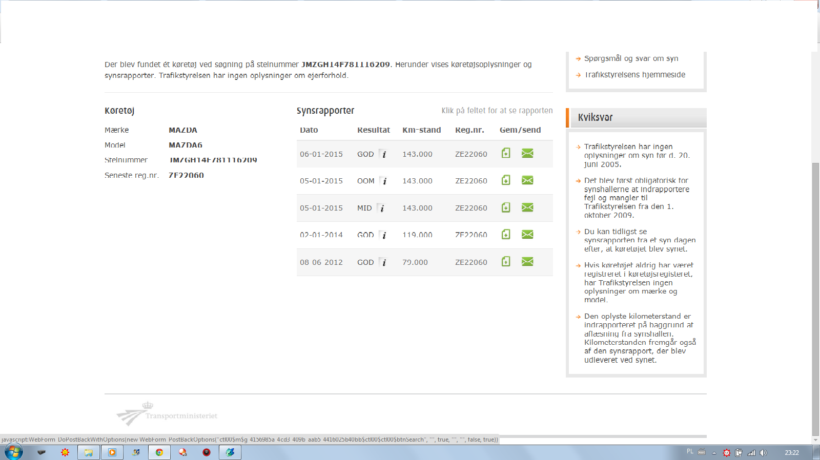 http://otomoto.pl/mazda-6-ii-2-0-exclus ... 90142.html W DSR nic nie ma, czyli nie serwisowana. Później dwa wpisy w 2012 i 2014 z duńskich przeglądów.