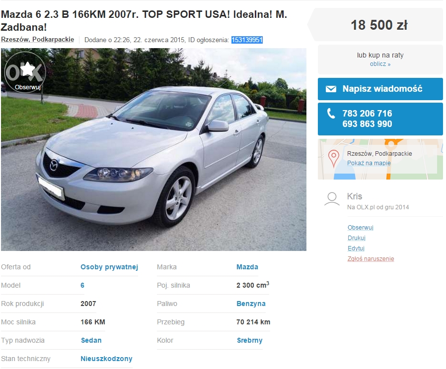 Mazda6 2.3 Pb, 2007, (olx: 153139951), 18.500 zł, Rzeszów.