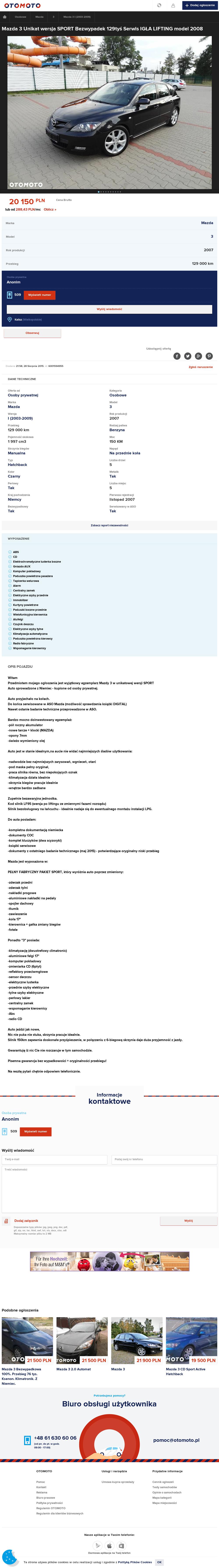 http://otomoto.pl/oferta/mazda-3-unikat ... ya50D.htmlMazda3 2.0 Pb, 2007, (otomoto: 6001594955), 20.150 zł, Kalisz.