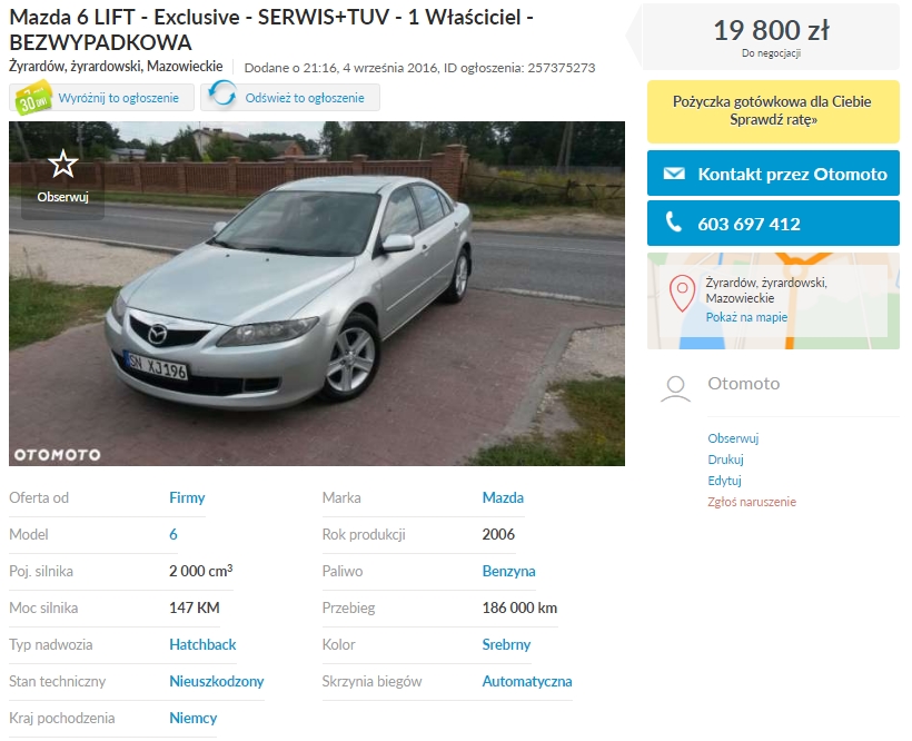 Mazda6 2.0 Pb, 2006, (olx: 257375273), 19.800 zł, Żyrardów.