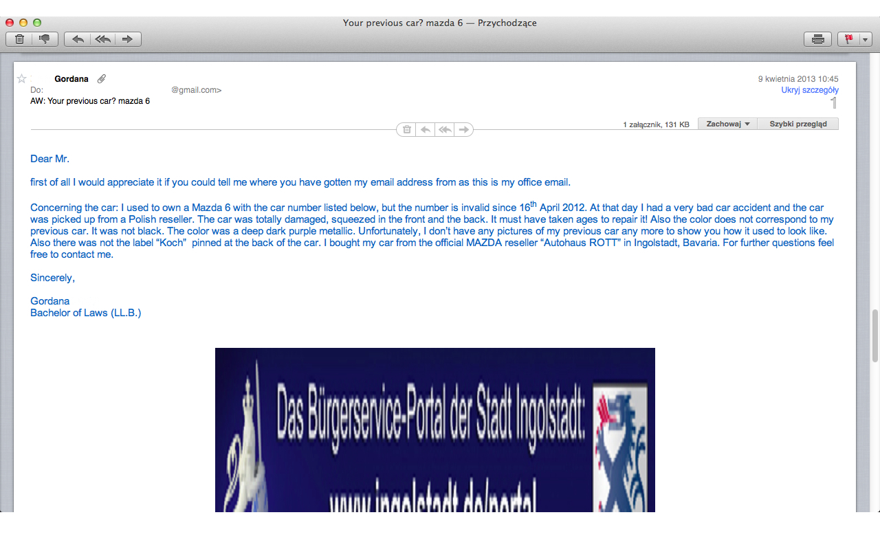 Normalnie aż się zarejestrowałem żeby to napisać bo mnie skręca jak coś takiego widzę. To sie tyczy zarówno adminów jak i przede wszystkim kolegi Zas3k. Jesteś bardzo rezolutnym człowiekiem znajdując maila poprzedniej właścicielki tej mazdy ale........... skoro kobieta Ci pomaga i pisze jak było naprawdę z jej samochodem to bądź tak miły przynajmniej zasłoń jej dane osobowe. Ludzie, to jest internet a to forum nie jest nawet zabezpieczone hasłem dla "wybranych". Nie wiem czy ktokolwiek na forum podał swoje imię i nazwisko, plus miejsce ukończenia studiów ale kolega Zas3k nie miał problemu w opublikowaniu go wszem i wobec i to obcej osoby... Prośba do Adminów – wykasujcie panowie tego screena bo "normalnie to chamstwo jest". A Ty kolega Zas3k-u bądź tak rezolutny przy udostępnianiu cudzych danych jak byłeś w poszukiwaniu jej mail-a.
